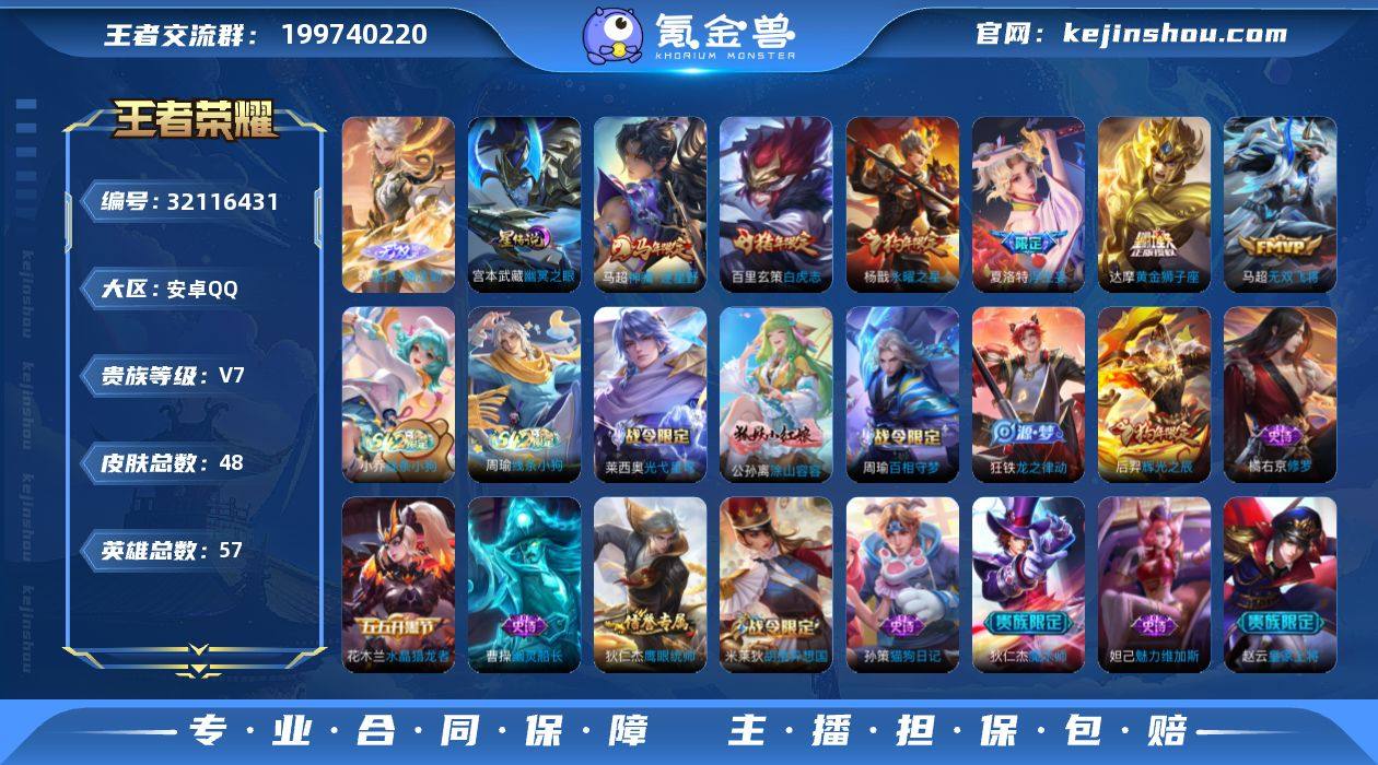 【秒换绑】安卓Q-V7-最强王者段位-57英雄-48皮肤-1无双-6传说-15史诗 【无双皮肤】:曜器灵螭龙剑 【传说皮肤】:马超神骥逐星野,夏洛特浮生妄,马超无双飞将,达摩黄金狮子座,百里玄策白虎志,杨戬永曜之星 【限定皮肤】:狄仁杰阴阳师,赵云皇家上将,狄仁杰魔术师,项羽海滩派对,后羿辉光之辰,杨戬永曜之星,百里玄策白虎志,米莱狄胡桃异想国,西施玲珑珍味,夏洛特浮生妄 【年限皮肤】:杨戬永曜之星,后羿辉光之辰,百里玄策白虎志 【赛季限定】:甄姬逆浪荇歌,亚瑟荣光之誓 【战令限定】:米莱狄胡桃异想国,西施玲珑珍味,周瑜百相守梦,孙策百相守梦,莱西奥光弋星穹,明世隐往忆晖光,周瑜线条小狗,小乔线条小狗 【史诗皮肤】:周瑜线条小狗,小乔线条小狗,莱西奥光弋星穹,公孙离涂山容容,周瑜百相守梦,狂铁龙之律动,米莱狄胡桃异想国,橘右京修罗,狄仁杰鹰眼统帅,孙策猫狗日记,后羿辉光之辰,花木兰水晶猎龙者,曹操幽灵船长,妲己魅力维加斯,狄仁杰魔术师,赵云皇家上将 【其他皮肤】:蚩奼极光幻客,明世隐往忆晖光,亚瑟荣光之誓,哪吒罗小黑战记,鬼谷子克喵,莱西奥踏浪烽翎,孙策百相守梦,甄姬逆浪荇歌,西施玲珑珍味,诸葛亮掌控之力,关羽龙腾万里,狄仁杰阴阳师,张飞五福同心,亚瑟死亡骑士,赵云忍炎影,项羽海滩派对,暃碧珀绯影,司空震启蛰,马超幸存者,曜归虚梦演,猪八戒年年有余,元歌午夜歌剧院,杨玉环霓裳曲,苏烈爱与和平,花木兰剑舞者 【营地ID】:1559759610 【星元皮肤】:宫本武藏幽冥之眼