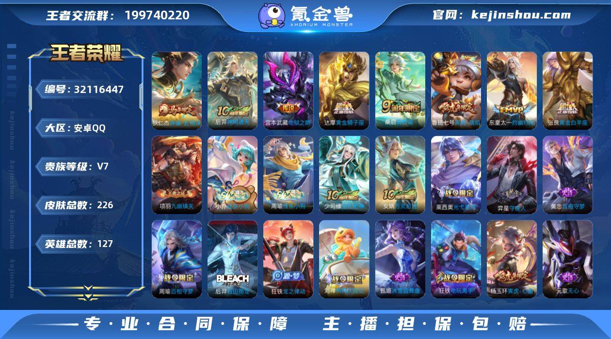 【mwz226】安卓Q-V7-至尊星耀III段位-127英雄-226皮肤-8传说-61史诗 【英雄全皮】:孙权全皮,敖隐全皮,空空儿全皮,影全皮 【传说皮肤】:狄仁杰神骥赴朔漠,后羿神树通天,桑启鸣野蒿,东皇太一灼幽烈阳,鲁班七号寅虎瑞焰,张良黄金白羊座,达摩黄金狮子座,宫本武藏地狱之眼 【限定皮肤】:蒙犽顽岩魄,蔡文姬夏日便利店,虞姬夏日便利店,姜子牙天穹之誓,狄仁杰阴阳师,廉颇寅虎御盾,赵云皇家上将,墨子神迹守卫,孙尚香蔷薇恋人,鲁班七号寅虎瑞焰,白起夜都怪侠,芈月幻夜卜梦,元歌无心,甄姬落雪兰心,狄仁杰魔术师,达摩沙漠行僧,项羽海滩派对,老夫子航海奇遇记,王昭君午后时光,兰陵王金庭之子,李元芳云中旅人,钟馗驱傩正仪,杨玉环寅虎心曲,干将莫邪胡桃夹子,雅典娜黎明之约,黄忠火炮绅士,梦奇顽趣,沈梦溪大漠名商,裴擒虎擒涛扼浪,狂铁电玩高手,嫦娥暖冬兔眠,鲁班大师探海日志,桑启海盐诗旅,暃星界游侠,艾琳流音漫舞,张良古海寻踪,蒙犽百解令,妲己灵卜魔法,鬼谷子天穹祈灯,沈梦溪龙舞盛年,鲁班七号蔬乡物语,刘邦剑破天穹,镜青焰无极,项羽苍威无极,周瑜熔金海岸 【年限皮肤】:鲁班七号寅虎瑞焰,廉颇寅虎御盾,杨玉环寅虎心曲 【赛季限定】:钟馗驱傩正仪,达摩沙漠行僧,兰陵王金庭之子,沈梦溪大漠名商,李元芳云中旅人,桑启海盐诗旅,裴擒虎擒涛扼浪,鲁班大师探海日志,张良古海寻踪,鬼谷子天穹祈灯,刘邦剑破天穹,姜子牙天穹之誓,东皇太一噬灭天穹,钟馗虚灵犬护,甄姬逆浪荇歌,亚瑟荣光之誓,雅典娜黎明之约,梦奇顽趣,牛魔星界战将,项羽九幽镇关 【战令限定】:老夫子航海奇遇记,墨子神迹守卫,黄忠火炮绅士,芈月幻夜卜梦,白起夜都怪侠,狂铁电玩高手,王昭君午后时光,甄姬落雪兰心,暃星界游侠,嫦娥暖冬兔眠,艾琳流音漫舞,妲己灵卜魔法,鲁班七...