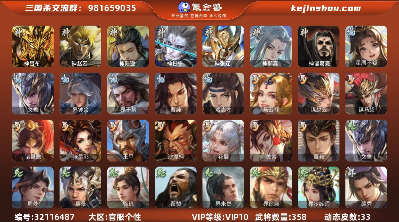 【2605】官阶:大将军;VIP等级:VIP10;史诗武将数量:45;动态皮肤数量:33;武将总数:358;史诗宝珠数量:17;将魂数量:2338;神将:10;魏国史诗武将:14;蜀国史诗武将:10;吴国史诗武将:7;群史诗武将:15 神吕布,神赵云,神陆逊,神甘宁,神张辽,神郭嘉,神关羽,神吕蒙,神周瑜,神诸葛亮,星周不疑,文鸯,界钟会,界于禁,曹纯,戏志才,关索,马云騄,谋赵云,谋马超,诸葛瞻,张星彩,王平,沙摩柯,花鬘,董允,周处,吴景,骆统,留赞,界朱然,界徐盛,界步练师,裴秀,界沮授,左慈,张让,星黄忠,苏飞,审配,南华老仙,沮授,界左慈,界李儒,公孙康,杜预,张绣,许攸,神甘宁-万人辟易(动态),神周瑜-焰腾麒麟(动态),神吕布-冠绝天下(动态),曹丕-气荡山河(动态),SP蔡文姬-兔年冬日(动态),许褚-虎啸生风(动态),界许褚-虎啸生风(动态),钟会-谋谟之勋(动态),界钟会-谋谟之勋(动态),曹纯-虎年春节(动态),刘备-龙御天下(动态),卧龙诸葛-龙跃凤鸣(动态),刘备-明良千古(动态),马超-虎年冬至(动态),黄月英-明良千古(动态),界刘备-明良千古(动态),界黄月英-明良千古(动态),马云騄-猪年大雪(动态),关索-虎年七夕(动态),鲍三娘-虎年七夕(动态),胡金定-明良千古(动态),孙策-兔年中秋(动态),周处-义除三害(动态),吕蒙-剑起惊澜(动态),孙权-兔年中秋(动态),孙权-永开吴祚(动态),周瑜-兔年七夕(动态),孙策-虎踞江东(动态),孙权-牛年七夕(动态),孙尚香-星流霆击(动态),大乔-猪年七夕(动态),界大乔-猪年七夕(动态),界孙权-牛年七夕(动态),界孙尚香-星流霆击(动态),步练师-牛年七夕(动态),朱然-剑舞枫飞(动态),界步练师-牛年七夕(动态),刘赞-灵魂歌王(动态),灵雎-霜刃绚练(动态),袁绍-声震寰宇(动态),杜预-龙吟破竹(动态),吕布-鼠年七夕(动态),袁绍-一往无前(动态),许攸-盛气凌人(动态),界吕布-鼠年七夕(动态),李儒-鸠杀少帝(动态),界李儒-鸠杀少帝(动态),SP貂蝉-驭魂...