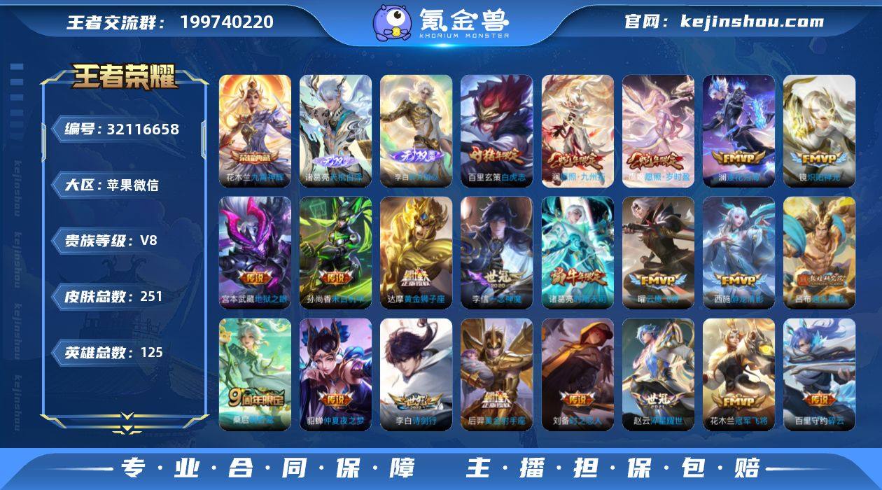 实名: 可修改 性别: 男号 贵族等级: V8 英雄数: 125 皮肤数: 251 荣耀水晶: 九霄神辉 无双皮: 碎月剑心,天机白泽 传说皮: 黄金狮子座,黄金射手座,冠军飞将,云鹰飞将,炽阳神光,一念神魔,末日机甲-孙尚香,地狱火,仲夏夜之梦,音你心动-小乔,地狱之眼,飞鸢探春,音你心动-周瑜,乞巧织情,时之恋人-刘备,游龙清影,淬星耀世,碎云,炽翼辉光,遇见神鼓,澜逐花归海 限定皮: 梁祝,时雨天司,辉光之辰,神威,冰霜恋舞曲,白虎志,至尊宝,玉兔公主,五谷丰年,诗剑行,鸣野蒿,逐霄战戟,愿照·岁时盈,愿照·九州拓 亮点: 【优质装备】:九霄神辉(木兰典藏),碎月剑心(李白无双),天机白泽,黄金狮子座,黄金射手座,冠军飞将,云鹰飞将(小将军),炽阳神光,一念神魔,末日机甲-孙尚香(绿蚂蚱),地狱火,仲夏夜之梦(大飞蛾),音你心动-小乔,地狱之眼,飞鸢探春,音你心动-周瑜,乞巧织情,时之恋人-刘备(电焊工),游龙清影(小青龙),淬星耀世,碎云,炽翼辉光(娃娃菜牛角包),遇见神鼓,澜逐花归海,涂山容容