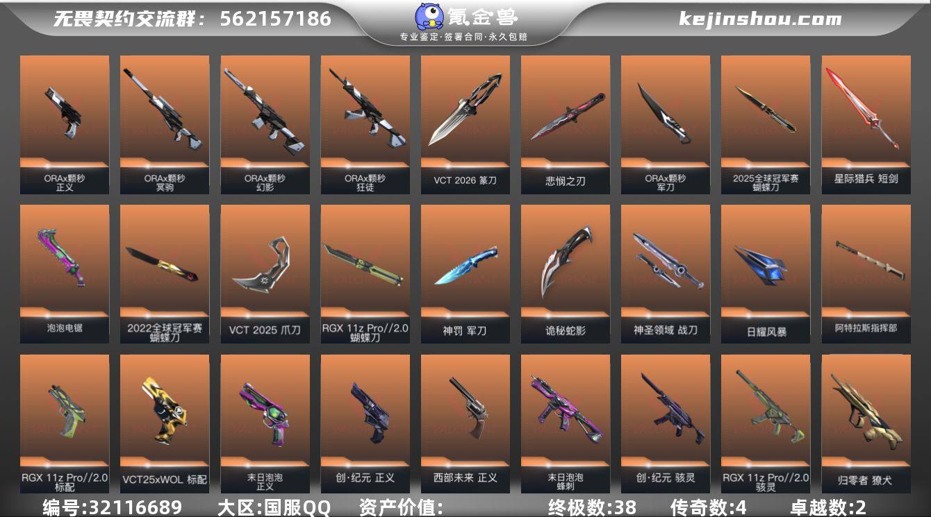 【PTWW3084】终极*38/传奇*4/卓越*2/皮肤*128/等级*227/段位:铂金/2025全球冠军赛/2022全球冠军赛/VCT 2026 赛季套装/无畏契约季前邀请赛套装/ORAx颗秒/末日泡泡套装/VCT 2025赛季礼包/RGX 11z Pro//2.0/创·纪元套装/幻棱/炼狱/维斯/暮蝶/钛狐/壹决/铁臂/捷风/雷兹/幽影/不死鸟/贤者/猎枭/蝰蛇/零/芮娜/奇乐/尚勃勒/霓虹/斯凯/夜露/星礈/K/O/海神/盖可/黑梦/钢锁/2025全球冠军赛 蝴蝶刀/蝴蝶刀-2022全球冠军赛/近战武器-碎心裂刃/VCT 2026 篆刀/无畏契约季前邀请赛 悲悯之刃/ORAx颗秒 军刀/泡泡电锯/RGX 11z Pro//2.0 蝴蝶刀/VCT 2025 爪刀/镭切/威龙之刃/军刀-神罚/诡秘蛇影/神圣领域 战刀/日耀风暴/阿特拉斯指挥部/星际猎兵 短剑/2025全球冠军赛 狂徒/狂徒-创·纪元/多弥尔的复仇 狂徒/狂徒-ORAx颗秒/狂徒-离子武器2.0/狂徒-赤焰铁骥/狂徒-诡秘蛇影/幻影-2022全球冠军赛/幻影-RGX 11z Pro//2.0/幻影-西部未来/幻影-末日泡泡/幻影-混沌序曲2.0/幻影-ORAx颗秒/幻影-神圣领域/幻影-末日之翼/戍卫-月球哨兵/戍卫-折光棱晶/獠犬-归零者/獠犬-神圣领域/冥驹-RGX 11z Pro//2.0/冥驹-末日泡泡/冥驹-ORAx颗秒/冥驹-星云暗涌/飞将-末日之翼/莽侠-创·纪元/莽侠-诡秘蛇影/莽侠-月球哨兵/战神-神圣领域/奥丁-末日之翼/判官-诡秘蛇影/雄鹿-月球哨兵/骇灵-创·纪元/骇灵-RGX 11z Pro//2.0/骇灵-无限竞技/骇灵-星云暗涌/蜂刺-末日泡泡/蜂刺-星云暗涌/蜂刺-折光棱晶/标配-RGX 11z Pro//2.0/标配-最终庇护/标配-折光棱晶/标配-VCT25xWOL/正义-创·纪元/正义-西部未来/正义-末日泡泡/正义-ORAx颗秒/正义-传奇制造/正义-月球哨兵/鬼魅-诡秘蛇影/鬼魅-星云暗涌/狂怒-神圣领域/短炮-末日之翼/热舞环节 卡面/复活专家 卡面/超能偶像 卡面/树懒大作战 卡面/Clutch 卡面/暂别喧嚣 卡面/无畏契约GO!第一卷:芮娜 卡面/无畏契约GO!第一卷:零...