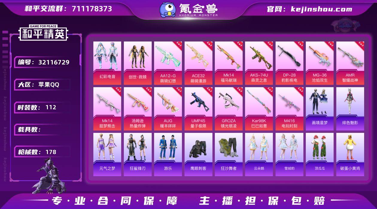苹果 手Q-6粉装-10特效枪-0载具-2粉色飞行器-67737热力值-15王牌印记-164套装-224枪皮 【热门品类】:套装-深海小丑鱼,套装-小丑鱼,角色-军刀雅典娜,角色-2P战斗服款,套装-SS1特训,套装-龟仙人,角色-8号机,角色-Mark.06 【粉色套装】:粉装-赤焰黑爵,粉装-紫电风暴,角色-复仇流浪者,粉装-未来歌姬,角色-宙之时溯,角色-罪夜之冕 【粉色枪皮等级】:SCAR-L-锦绣绵绵(五级),M416-电玩时刻(五级),ARX-无垠阁(四级),Vector-环太平洋(七级),AKS-74U-森灵之息(五级),Kar98K-巳巳如意(五级),DP-28-千金淑猫(六级),DP-28-豹影疾电(五级) 【粉色枪皮】:SCAR-L-锦绣绵绵,M416-电玩时刻,AUG-罪夜之冕,ARX-无垠阁,Vector-环太平洋,AKS-74U-森灵之息,Kar98K-巳巳如意,Mk14-福马献瑞,DP-28-千金淑猫,DP-28-豹影疾电 【粉色飞行器】:炫彩糖果飞行器,拂晓神骑飞行器 【粉色降落伞】:极限特训降落伞,百万伏特降落伞,梦幻火箭降落伞,洛神天依降落伞,环太平洋降落伞,未来歌姬降落伞,圣堂之誓降落伞,花傲天降落伞,精灵梦叶罗丽降落伞,临安公主降落伞,樱桃泡泡降落伞,无垠阁降落伞,罪夜之冕降落伞 【稀有套装】:套装-龟仙人,套装-糖糖葫芦,套装-青团波波,角色-怀庆长公主,套装-燕燕于飞,套装-鱼渊荷华,角色-绯色魅影,套装-书海巡游,套装-画境星梦,套装-琴音绮想,角色-霜刃之御,角色-月烬之祷,套装-雨过天青,套装-红釉青花 【稀有枪皮】:AKM-2P战斗服款,AKM-环太平洋,AKM-破晓战魂,AKM-虎虎生威,AKM-龙的传人,M16A4-凝视深渊,M16A4-生命誓言,M16A4-蓝色火焰,SCAR-L-红色方程式,SCAR-L-净心行者,M416-滑板小狐,M416-糯团青竹,M416-红色方程式,M416-绿野极光,M416-蓝色火焰,GROZA-懵萌河马,GROZA-治愈之星,AUG-天降萌叽,AUG-耀粉歌者,QBZ-原初圣火,QBZ-彩...
