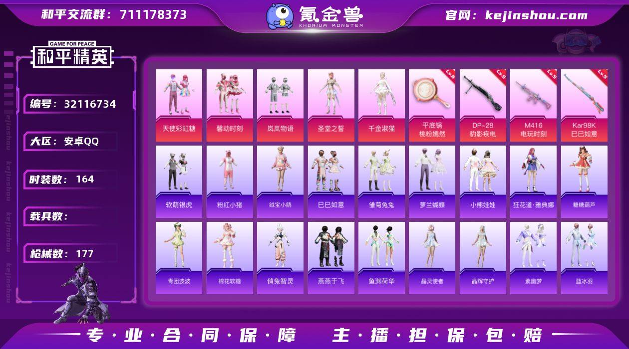 【特价出售】安卓 手Q-5粉装-4特效枪-0载具-2粉色飞行器-56493热力值-6王牌印记-164套装-177枪皮 【热门品类】:套装-粉红小猪 【粉色套装】:粉装-天使彩虹糖,粉装-馨动时刻,粉装-岚岚物语,角色-圣堂之誓,角色-千金淑猫 【粉色枪皮等级】:M416-电玩时刻(五级),Kar98K-巳巳如意(五级),DP-28-豹影疾电(五级),平底锅-桃粉嫣然(六级) 【粉色枪皮】:M416-电玩时刻,Kar98K-巳巳如意,DP-28-豹影疾电,平底锅-桃粉嫣然 【粉色飞行器】:炫彩糖果飞行器 【粉色降落伞】:神秘黑猫降落伞,心之恋语降落伞,夏日绵绵冰降落伞,碧影闪光降落伞,炙焰牛王降落伞,圣光天使降落伞,垂柳戏鸭降落伞,暗夜鎏金降落伞,莲影清波降落伞,小叽联名款降落伞,精灵梦叶罗丽降落伞,千金淑猫降落伞,炫彩糖果降落伞 【稀有套装】:套装-绒宝小鹅,套装-巳巳如意,套装-炫彩糖果,套装-雏菊兔兔,套装-萝兰蝴蝶,套装-小熊娃娃,角色-狂花道·雅典娜,套装-糖糖葫芦,套装-青团波波,套装-棉花软糖,角色-俏兔智灵,套装-燕燕于飞,套装-鱼渊荷华,套装-晶灵使者,套装-晶辉守护,套装-紫幽梦,套装-蓝冰羽,套装-极速光影 【稀有枪皮】:AKM-彩虹符号,AKM-恐龙拽拽,AKM-破晓战魂,AKM-龙的传人,M16A4-天使羽翼,M16A4-幻世战舞者,M16A4-甜心亚梦,M16A4-红色方程式,M16A4-蓝色火焰,SCAR-L-夜灯,SCAR-L-玉兔迎春,SCAR-L-红色方程式,M416-神秘黑猫,M416-糯团青竹,M416-红色方程式,M416-蓝色火焰,GROZA-彩虹符号,GROZA-田园牧歌,AUG-耀粉歌者,QBZ-彩虹符号,QBZ-神秘黑猫,QBZ-飞驰魅影,QBZ-魔药课室,AC-VAL-天降萌叽,AC-VAL-快闪甜心,AC-VAL-甜心亚梦,蜜獾-垂柳戏鸭,蜜獾-天降萌叽,蜜獾-娇憨猪猪,UZI-啾咪啾咪,UZI-娇憨猪猪,UZI-红色方程式,UMP45-涂山之恋,UMP45-生命誓言,UMP45-蓝色火焰,Vector...