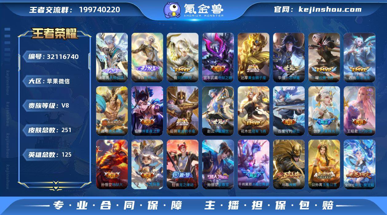 V8 1典藏 2无双 28传说 125英雄 251皮肤 可修改实名 【稀有英雄】敖隐(小龙人),大司命,嬴政(始皇帝),韩信(韩跳跳),夏洛特(夏师傅),艾琳,橘右京(橘子),娜可露露(鸟人),不知火舞,赵云,金蝉(唐僧),戈娅 【荣耀水晶】九霄神辉(木兰典藏) 【无双皮】天机白泽,碎月剑心(李白无双) 【传说皮】游龙清影(小青龙),黄金狮子座,黄金射手座,地狱火,仲夏夜之梦(大飞蛾),地狱之眼,末日机甲-孙尚香(绿蚂蚱),一念神魔,淬星耀世,冠军飞将,云鹰飞将(小将军),炽阳神光,音你心动-小乔,音你心动-周瑜,乞巧织情,时之恋人-刘备(电焊工),飞鸢探春,碎云,炽翼辉光(娃娃菜牛角包),遇见神鼓,澜逐花归海 【珍宝阁皮】胡桃夹子,优雅恋人 【赛季/战令皮】噬灭天穹(s37),古海寻踪(s33),星界游侠,海盐诗旅(s30),擒涛扼浪(s31),探海日志(s32),剑破天穹(s35),天穹祈灯(s34),天穹之誓(s36),暖冬·兔眠,暗影游猎(游乐娃子),云中旅人(s29) 【史诗皮】器灵·浮梦炉,星界战将,谪仙醉月,星界特工,蔬乡物语(鲁班七号),乘龙·聚宝船(安琪拉年限),茶境仙,百相守梦-黄忠,线条小狗-周瑜,九幽镇关,万灵启世,涂山容容,织梦人,龙之律动,紫霞仙子,苍穹之光,白龙吟,黄金分割率,特工魅影,千年之狐,末日机甲-莱西奥,江河有灵,百解令(蒙犽),高渐离燃音魔法,蒙恬荣光圣徽,电玩·爆裂旋风,龙骑士(小龙虾),暗夜猫娘,魅语,晚萤,冰冠公主,末日机甲-吕布,猫狗日记-孙策,猫狗日记-大乔,时之恋人-孙尚香,乱世虎臣,节奏热浪,修罗,女仆咖啡,摇滚巨星,水果甜心,绅士熊喵,天才门将,星夜王子,心灵骇客,功夫厨神,德古拉伯爵,暗隐猎兽者,幽灵船长,鬼剑武藏,暗渊魔法,心灵战警,乐园奇幻夜,地狱岩魂,纤云弄巧,缤纷独角兽,乘风破浪,逐浪之夏,水晶猎龙者,曙光守护者,箭羽风息,原初追逐者,圣诞狂欢,圣诞恋歌,鹰眼统帅,暗夜贵公子,黎明之约,未来纪元-赵云 【限定皮】愿照·九州拓(澜年限),愿照·岁时...