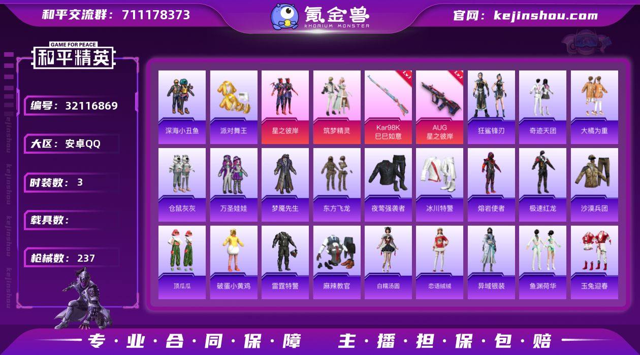M1046736【身法号3粉装-7特效枪 AUG-星之彼岸[7级] 游骑兵面罩 派对舞王,深海小丑鱼,SS1特训】安卓手Q-3粉装-7特效枪-208套装-237枪皮-16王牌印记-荣耀皇冠Ⅳ-70036热力值【3粉装】角色-异瞳寒姬,星之彼岸,筑梦精灵【7特效枪】DP-28-豹影疾电[5级],AUG-星之彼岸[7级],AA12-G-萌骑幻想[5级],MG-36-沧焰双生[5级],Mk14-福马献瑞[5级],Kar98K-巳巳如意[5级],AKS-74U-森灵之息[5级]【5稀有】派对舞王,深海小丑鱼,SS1特训,AKM-奇异狩猎者,AKM-缤纷海域【9飞行器】马上有福飞行器,异域银装飞行器,霓虹街区飞行器,炫彩糖果飞行器,黄色滑翔尾迹,登顶巅峰飞行器,狂鲨锋刃飞行器,星之彼岸飞行器,紫色滑翔尾迹【5头盔】精灵迷巫头盔,梦幻火箭头盔,金风玉露头盔,甜心宝贝头盔,深海小丑鱼头盔【3背包】水曜玄武背包,深海小丑鱼背包,甜心宝贝背包【430其它衣服和枪皮】神秘领域,特种空勤,SS26特训,甜蜜菠萝,东方飞龙,智谋强哥,灰色格斗者,竞技勇士朋克,街头潮人,漫游都市,万圣娃娃,迷域探索者,角色-紫俏灵猫,SS35特训,SS34特训,牛气满满,5.56爱好者,金鼠迎春,朱霞炽焰,潮流炫酷,冷血极客,派对绅士,跃动心情,燃烧卡路里,麻辣教官,冰川格斗者,伏击者,绯格组合,SS5特训,角色-唐三,极地朋克,海岛探路者,灼焰舞者,都市魅力,角色-罗莉,青春校园,雷霆特警,太极红客,SS3特训,SS31特训,奇迹天团,SS19特训,冰川特警,六六大吉,魅力单车,彩虹骑师,和平特警,恋语绒绒,雪国风尚,酒红色名流,坚韧舞者,黑色伏地魔,薄荷星砂,鱼渊荷华,SS9特训,都市漫游者,巳巳如意,玲珑飞花,白糯汤圆,北国孤狼,SS25特训,极速红龙,SS12特训,探宝勇士,完美偶像,野性战魂,白色伏地魔,SS33特训,冷焰舞者,街舞达人,琴音绮想,酷潮明星,蓝调潮人,滨海厨神,云魄琉璃,核芯基因,深蓝冒险家,SS17特训,夜莺强袭者,攀登者,霓虹街区,破晓战魂,福马献瑞,精神漫游,