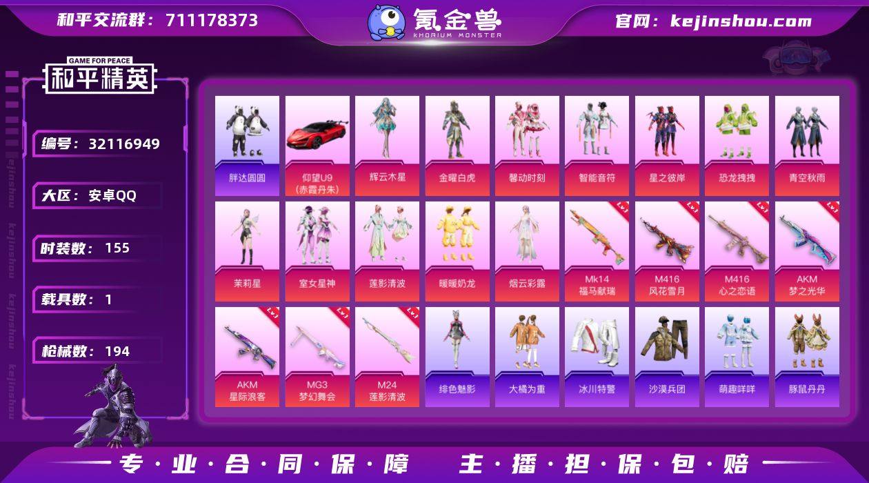 M1046717【女号1载具-13粉装-8特效枪 暖暖奶龙 小丑鱼 暗影哥特 胖达圆圆】安卓手Q-1载具-13粉装-8特效枪-155套装-194枪皮-9王牌印记-不朽星钻Ⅳ-70210热力值【1载具】仰望U9(赤霞丹朱)【13粉装】莲影清波 角色-辉云木星 角色-幻影 角色-茉莉星 室女星神 暖暖奶龙 智能音符 金曜白虎 角色-烟云彩露 青空秋雨 馨动时刻 恐龙拽拽 星之彼岸【8特效枪】AKM-星际浪客[3级] MG3-梦幻舞会[6级] Mk14-辉云木星[4级] AKM-梦之光华[5级] M416-心之恋语[7级] M24-莲影清波[4级] Mk14-福马献瑞[3级] M416-风花雪月[1级]【4稀有】小丑鱼 暗影哥特 胖达圆圆 M762-奇异狩猎者【9飞行器】空岛之星尾迹 BEARBRICK飞行器 庄周梦蝶飞行器 夜幕颂歌飞行器 星夜魔法师飞行翼 登顶巅峰飞行器 极意拳锋飞行器 光之冒险尾迹 天之羽翼飞行器【1头盔】花间之火头盔【2背包】甜心宝贝背包 金风玉露背包【324其它衣服和枪皮】飞驰魅影 田园牧歌 角色-霜纹水星 红色运动 格斗先锋 SS23特训 SS19特训 萌黄之夏 纯真浪花 热情海星 绚烂繁星 贝斯之夜 音速流光 角色-银尘 浑天鲲鹏 魅力单车 冰川特警 龙的传人 焰鹰斗篷 幻羽潜行 SS18特训 霓虹极客 完美偶像 酒红色名流 星梦畅游 夏雨游龙 绝对偶像 橘黑制服 骑行爱好者 夏日音浪 角色-蝶吟花词 娇憨猪猪 纯白誓言 柠萌假日 SS21特训 雪兔飞飞 人气偶像 蝶变 破晓战魂 龙魂突击队 快乐星愿 惊鸿侠骨 异彩先驱 老实芭蕉 SS26特训 光之冒险 幻世战舞者 酸甜橘柚 黎明保卫者 角色-Mark.06 缤纷果语 辉星之火 麻辣教官 雏菊兔兔 SS30特训 白色伏地魔 SS27特训 狙击之神 黄色名流 妙红点点 创世·幻影 角色-绯色魅影 青年教官 萌趣咩咩 雨过天青 SS29特训 猎鹰 猎梦纪元 香桃花海 角色-军刀雅典娜 甜蜜告白 黄色伏地魔 玉兔迎春 SS28特训 春光漫游 空岛之星 角色-瑰石海星 SS20特训