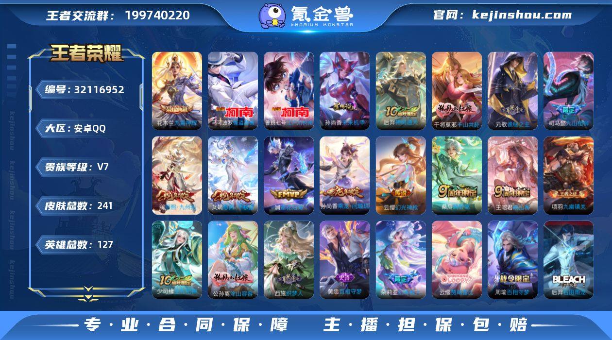 CHC30234,1星元/21按键,安卓Q-V7-永恒钻石I段位-127英雄-241皮肤-1典藏皮肤-2珍品传说-11传说-76史诗 【英雄全皮】:孙权全皮,苍全皮,戈娅全皮,空空儿全皮,影全皮,姬小满全皮 【荣耀典藏】:花木兰九霄神辉 【珍品传说】:鲁班七号江户川柯南,马可波罗怪盗基德 【传说皮肤】:后羿神树通天,干将莫邪千山共赴,元歌诡秘之主,司马懿九山相柳,女娲愿照千秋盛,澜愿照九州拓,云缨幻光神枪,王昭君映山客,桑启鸣野蒿,孙尚香乘龙问璇玑,澜逐花归海 【限定皮肤】:蒙犽顽岩魄,大乔绒语心约,姜子牙天穹之誓,杨戬破阵退雄兵,李白谪仙醉月,狄仁杰阴阳师,赵云皇家上将,嬴政优雅恋人,芈月白晶晶,元歌云间偶戏,狄仁杰魔术师,项羽海滩派对,李元芳银河之约,李元芳匿光侦查者,杨玉环遇见飞天,女娲朔望之晖,百里玄策原初追逐者,裴擒虎擒涛扼浪,云中君纤云弄巧,上官婉儿梁祝,嫦娥拒霜思,嫦娥暖冬兔眠,鲁班大师探海日志,桑启海盐诗旅,戈娅驭风魔法,艾琳流音漫舞,司空震地狱燃心,阿古朵江河有灵,张良古海寻踪,蒙犽百解令,鬼谷子天穹祈灯,伽罗琥珀纪元,姬小满妄想食味,大乔乘龙忆丹青,安琪拉乘龙聚宝船,孙尚香乘龙问璇玑,沈梦溪龙舞盛年,鲁班七号蔬乡物语,李元芳蔬乡物语,刘邦剑破天穹,程咬金群星魔术团,镜青焰无极,项羽苍威无极,刘备异域游侠,周瑜熔金海岸 【年限皮肤】:孙尚香乘龙问璇玑,大乔乘龙忆丹青,安琪拉乘龙聚宝船,女娲愿照千秋盛,澜愿照九州拓 【赛季限定】:桑启海盐诗旅,裴擒虎擒涛扼浪,鲁班大师探海日志,张良古海寻踪,鬼谷子天穹祈灯,刘邦剑破天穹,姜子牙天穹之誓,东皇太一噬灭天穹,太乙真人谧流熔炉,钟馗虚灵犬护,甄姬逆浪荇歌,亚瑟荣光之誓,百里玄策原初追逐者,牛魔星界战将,项羽九幽镇关 【战令限定】:女娲朔望之晖,李元芳银河之约,...