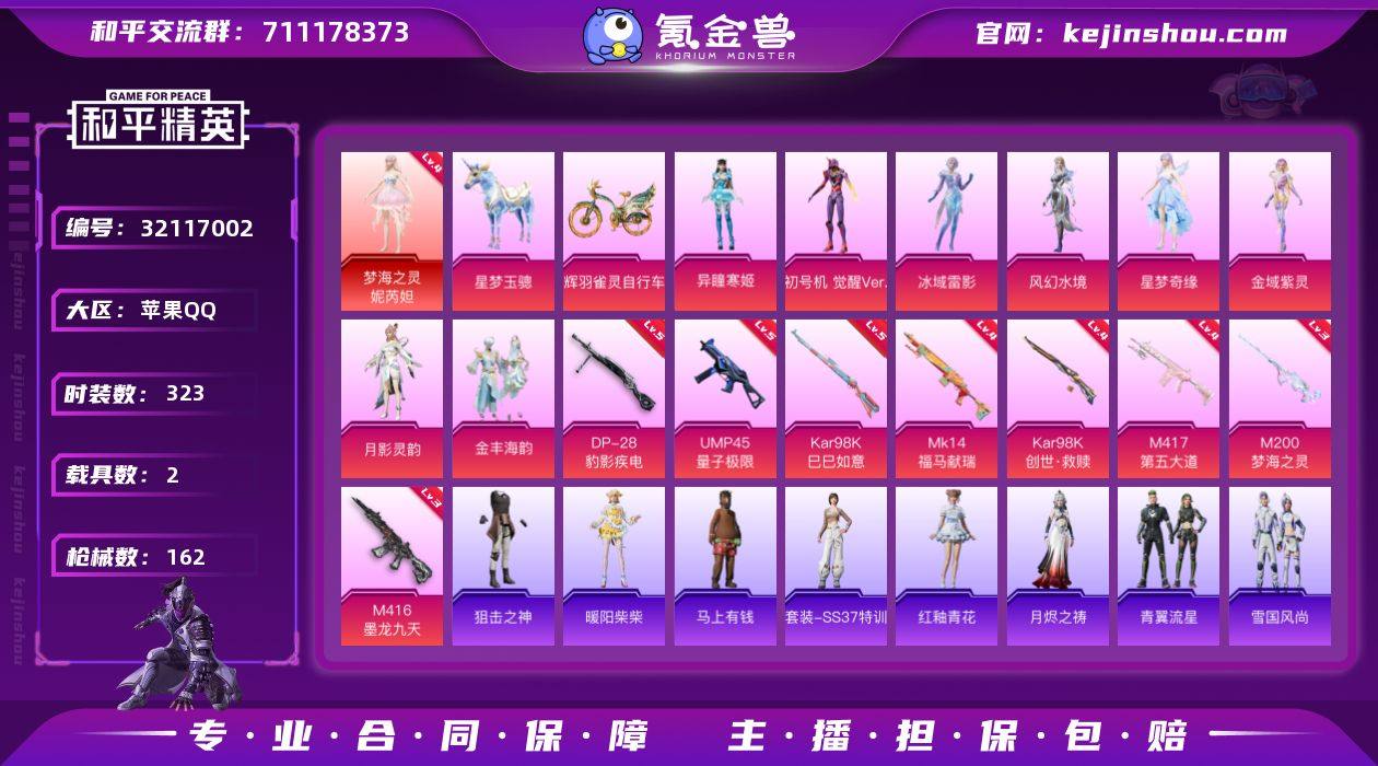 实名:不可二次实名 是否支持人脸包赔:支持 粉装数量:8 特效枪数量:8 载具数:2 时装数:323 枪械数:162 四级梦海之灵-妮芮妲 异瞳寒姬,冰域雷影,初号机 觉醒Ver.,风幻水境,金丰海韵,金域紫灵,星梦奇缘,月影灵韵 五级DP-28-豹影疾电,五级Kar98K-巳巳如意,五级UMP45-量子极限,四级MK14-福马献瑞,四级Kar98K-创世·救赎,四级M417-第五大道,三级M200-梦海之灵,三级M416-墨龙九天 辉羽雀灵自行车,星梦玉骢 狙击之神,马上有钱,暖阳柴柴,红釉青花,SS37特训,雨过天青,青翼流星,月烬之祷,雪国风尚,画境星梦,琴音绮想,书海巡游,SS36特训,萌鸡速递,风迹短诗,秘语星愿,SS35特训,午间小调,元气之梦,喜羊羊,薄荷星砂,凌霄紫焰,擎苍青焰,SS34特训套装,朱霞炽焰,8号机,缤纷果语,冰公主,滨海厨神,冰河战士,白熊同盟,彩虹兔,雏菊兔兔,长空猛禽,创世·幻影,纯真浪花,顶瓜瓜,蝶变,大橘大利,都市丽猫,绯格组合,粉恋花,龟仙人,湖畔霞光,幻羽潜行,竞技名士,极速光影,街头风暴,绛羽幽主,蓝冰羽,龙魂突击队,萝兰蝴蝶,Mark.06,摩登魅猫,棉花软糖,米开朗基罗,曼妙人鱼,柠萌假日,破晓战魂,情公主,青涩时光,青团波波,云朵鹅,热情海星,深蓝色名流,SS27特训,SS28特训,SS29特训,SS30特训套装,SS31特训套装,SS32特训套装,SS33特训套装,糖糖葫芦,兔兔小魔女,听雨铃兰,完美偶像,雪绒豹,小熊娃娃,星影赞美诗,樱梦幻音,焰鹰斗篷,鱼渊荷华,幽夜迷踪,燕燕于飞,异域银装,紫幽梦 雀灵庇佑飞行器,罪夜之冕降落伞,炫彩糖果降落伞,初号机 觉醒Ver.降落伞,创世·救赎降落伞,精灵梦叶罗丽降落伞,江南烟雨降落伞,绝色倾城降落伞,魔法神域降落伞,墨龙九天降落伞,千金淑猫降落伞,绮梦流光降落伞,忍者神龟降落伞,星梦奇缘降落伞,星穹咏叹调降落伞 卖家说:加50,送600点卷