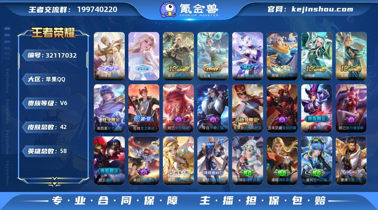 【秒换绑】苹果Q-V6-至尊星耀V段位-58英雄-42皮肤-2无双-3传说-12史诗 【无双皮肤】:甄姬雪境奇遇,孙悟空无相 【传说皮肤】:后羿神树通天,公孙离云诺千山,大乔时之奇旅 【限定皮肤】:狄仁杰阴阳师,赵云皇家上将,狄仁杰魔术师,项羽海滩派对,大乔时之奇旅,米莱狄胡桃异想国 【战令限定】:米莱狄胡桃异想国 【史诗皮肤】:赵云皇家上将,狄仁杰魔术师,宫本武藏鬼剑武藏,妲己魅力维加斯,妲己女仆咖啡,李白千年之狐,米莱狄胡桃异想国,桑启奇遇星旅,狂铁龙之律动,莱西奥光弋星穹,女娲万灵启世,少司缘巫礼祀神,周瑜线条小狗 【其他皮肤】:项羽海滩派对,韩信街头霸王,赵云忍炎影,宫本武藏未来纪元,安琪拉玩偶对对碰,亚瑟死亡骑士,后羿阿尔法小队,狄仁杰阴阳师,戈娅危途狂花,牛魔牛运亨通,西施雪境奇遇,亚瑟荣光之誓,明世隐往忆晖光,艾琳鹤鸣心笺,曹操逐霄之志,蚩奼极光幻客,虞姬溯影追猎,安琪拉糖果风暴,蒙恬苍云破阵,桑启线条小狗,马可波罗激情绿茵,诸葛亮星航指挥官,黄忠芝加哥教父,裴擒虎街头旋风 【营地ID】:1569291526