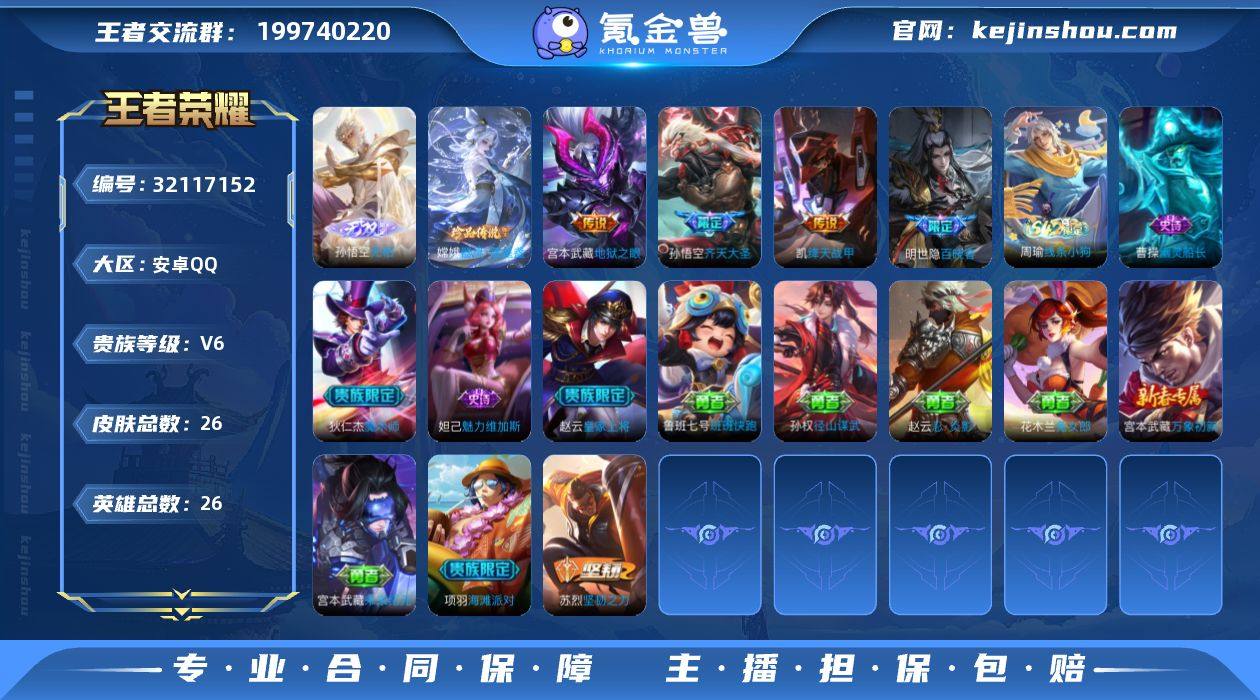 【无相 1无双1珍品3传说可秒换绑】安卓QQ-26英雄-26皮肤【无双皮肤】无相【珍品传说】器灵·落星盏【传说皮肤】地狱之眼 齐天大圣 绛天战甲【史诗皮肤】百晓客 幽灵船长 魅力维加斯 魔术师 皇家上将【勇者皮肤】径山谋武 线条小狗 班班快跑 未来纪元 万象初新 兔女郎 坚韧之力 海滩派对 忍·炎影 营地ID:1501349290