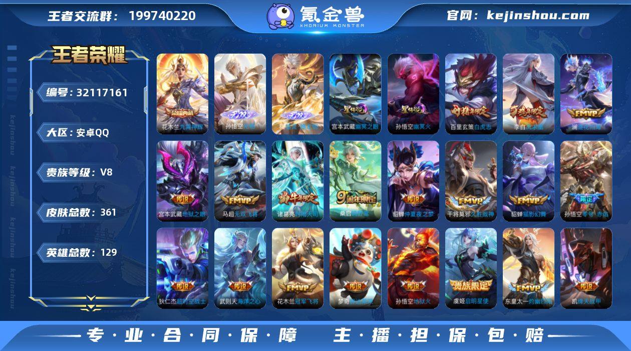 V8 2典藏 2无双 21传说 2星元 361皮肤 129英雄 【2水晶】花木兰-九霄神辉【2无双】曜-器灵·螭龙剑,孙悟空-无相【21传说】马超-无双飞将,百里玄策-白虎志,狄仁杰-超时空战士,貂蝉-仲夏夜之梦,貂蝉-猫影幻舞,干将莫邪-久胜战神,宫本武藏-地狱之眼,花木兰-冠军飞将,铠-绛天战甲,李白-凤求凰,梦奇-胖达荣荣,孙悟空-地狱火,孙悟空-零号·赤焰,武则天-海洋之心,虞姬-启明星使,诸葛亮-时雨天司,东皇太一-灼幽烈阳,澜-逐花归海,桑启-鸣野蒿【2星元】孙悟空-幽冥火,宫本武藏-幽冥之眼【86史诗】元歌-无心,赵云-未来纪元,阿轲-暗夜猫娘,阿轲-节奏热浪,白起-星夜王子,百里守约-特工魅影,百里玄策-原初追逐者,不知火舞-魅语,蔡文姬-舞动绿茵,曹操-幽灵船长,蔡文姬-繁星吟游,嫦娥-拒霜思,程咬金-功夫厨神,妲己-女仆咖啡,妲己-魅力维加斯,狄仁杰-魔术师,狄仁杰-鹰眼统帅,典韦-蓝屏警告,貂蝉-圣诞恋歌,东皇太一-逐梦之光,伽罗-天狼溯光者,干将莫邪-冰霜恋舞曲,干将莫邪-真爱魔法,公孙离-蜜橘之夏,宫本武藏-鬼剑武藏,关羽-冰锋战神,韩信-白龙吟,韩信-逐梦之影,花木兰-水晶猎龙者,花木兰-青春决赛季,花木兰-瑞麟志,花木兰-默契交锋,橘右京-修罗,黄忠-火炮绅士,铠-曙光守护者,铠-青龙志,兰陵王-暗隐猎兽者,兰陵王-驯魔猎人,老夫子-航海奇遇记,李白-千年之狐,李元芳-逐浪之夏,李元芳-银河之约,廉颇-地狱岩魂,刘邦-德古拉伯爵,刘禅-绅士熊喵,刘禅-天才门将,露娜-紫霞仙子,露娜-一生所爱,鲁班七号-电玩小子,鲁班七号-狮舞东方,吕布-圣诞狂欢,吕布-末日机甲,米莱狄-胡桃异想国,墨子-金属风暴,墨子-龙骑士,哪吒-逐梦之翼,裴擒虎-梅西,上官婉儿-梁祝,裴擒虎-李小龙,孙策-猫狗日记,孙尚香-水果甜心,孙尚香-蔷薇恋人,孙悟空-大圣娶亲,孙尚香-时之恋人,王昭君-凤凰于飞,王昭君-偶像歌手,夏侯惇-乘风破浪,小乔-缤纷独角兽,雅典娜-黎明之约,亚瑟-...