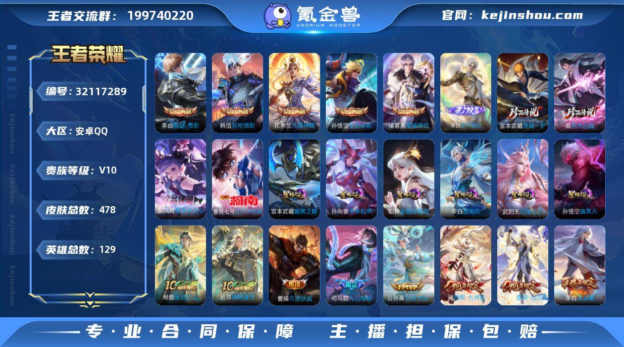 V10 6典藏 1无双 4珍品 64传说 6星元 478皮肤 129英雄 【6水晶】花木兰-九霄神辉,李白-鸣剑·曳影,孙悟空-全息碎影,诸葛亮-星域神启,韩信-弑枪猎影【1无双】李白-碎月剑心【4珍品传说】鲁班七号-江户川柯南,安琪拉-酷洛米之心,宫本武藏-黑崎一护,暃-朽木白哉【64传说】曜-山海·苍雷引,孙悟空-齐天大圣,李信-山海·炽霜斩,李白-诗剑行,不知火舞-绯月行,橘右京-枫霜尽,孙尚香-音你闪耀,马超-无双飞将,达摩-黄金狮子座,狄仁杰-超时空战士,貂蝉-仲夏夜之梦,干将莫邪-久胜战神,宫本武藏-地狱之眼,关羽-武圣,后羿-黄金射手座,镜-炽阳神光,李白-凤求凰,李信-一念神魔,李元芳-飞鸢探春,刘备-时之恋人,吕布-天魔缭乱,裴擒虎-寅虎·赤拳,孙策-末日机甲,孙尚香-末日机甲,孙悟空-地狱火,孙悟空-零号·赤焰,王昭君-乞巧织情,武则天-海洋之心,虞姬-启明星使,张良-黄金白羊座,赵云-淬星耀世,诸葛亮-武陵仙君,吕布-怒海麟威,宫本武藏-惊梅引,东皇太一-灼幽烈阳,夏洛特-浮生妄,典韦-战鼓燎原,赵云-乘龙·铭钟鼎,澜-电玩·雷克斯,露娜-霜月吟,艾琳-觅芳踪,澜-逐花归海,马超-琥珀纪元,铠-冥王哈迪斯,露娜-启示之音,曜-云鹰飞将,桑启-鸣野蒿,嬴政-玄雷天君,云缨-幻光神枪,裴擒虎-祥瑞亨通,司空震-愿照·山河定,澜-愿照·九州拓,西施-续相思,公孙离-云诺千山,司马懿-九山相柳,后羿-神树通天,杨戬-纵目迁山,曹操-万灵伏威【6星元】孙尚香-未来机甲,武则天-幻海之心,孙悟空-幽冥火,宫本武藏-幽冥之眼,貂蝉-金色仲夏夜之梦,李白-玉鸾吟【127史诗】元歌-无心,鬼谷子-五谷丰年,妲己-时之奇旅,赵云-未来纪元,钟无艳-超时空战士,狂铁-电玩高手,高渐离-天秀·音浪,貂蝉-唤灵魅影,艾琳-奇遇舞章,澜-赏金猎手,明世隐-吟游魔法,公孙离-玉兔公主,赵云-百木心枪,夏洛特-永昼,阿轲-暗夜猫娘,阿轲-节奏热浪,安琪拉-心灵骇客,安琪拉-时之奇旅,白起-星夜王子,百里...