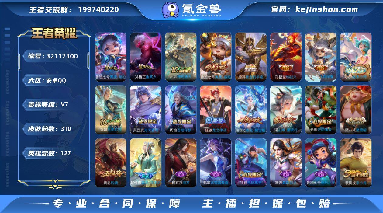 V7 1珍品 6传说 2星元 310皮肤 127英雄 【1珍品传说】【6传说】后羿-黄金射手座,李元芳-飞鸢探春,鲁班七号-寅虎·瑞焰,孙悟空-地狱火,后羿-神树通天【2星元】孙悟空-幽冥火,鲁班七号-寅虎焰心【67史诗】元歌-无心,鬼谷子-五谷丰年,赵云-未来纪元,钟无艳-超时空战士,张良-千筹问战,狂铁-电玩高手,阿轲-节奏热浪,阿轲-迷踪丽影,安琪拉-心灵骇客,百里守约-特工魅影,曹操-幽灵船长,蔡文姬-繁星吟游,嫦娥-拒霜思,妲己-女仆咖啡,妲己-魅力维加斯,狄仁杰-魔术师,狄仁杰-鹰眼统帅,伽罗-箭羽风息,干将莫邪-真爱魔法,宫本武藏-鬼剑武藏,花木兰-水晶猎龙者,黄忠-烈魂,橘右京-修罗,黄忠-火炮绅士,李白-千年之狐,李元芳-逐浪之夏,刘禅-天才门将,露娜-紫霞仙子,鲁班七号-电玩小子,鲁班七号-狮舞东方,鲁班七号-乒乒小将,吕布-圣诞狂欢,吕布-末日机甲,墨子-金属风暴,上官婉儿-梁祝,裴擒虎-李小龙,孙策-猫狗日记,孙尚香-水果甜心,孙尚香-蔷薇恋人,夏侯惇-乘风破浪,雅典娜-冰冠公主,亚瑟-心灵战警,杨玉环-遇见飞天,嬴政-摇滚巨星,嬴政-优雅恋人,元歌-云间偶戏,云中君-纤云弄巧,张飞-乱世虎臣,赵云-皇家上将,甄姬-冰雪圆舞曲,钟馗-乐园奇幻夜,猪八戒-猪悟能,庄周-高山流水,瑶-山海·碧波行,暃-星界游侠,百里守约-真我赫兹,盾山-梦圆繁星,刘禅-电玩·爆裂旋风,蒙犽-百解令,伽罗-琥珀纪元,安琪拉-乘龙·聚宝船,赵怀真-器灵·浮梦炉,狂铁-龙之律动,周瑜-百相守梦,小乔-线条小狗,女娲-万灵启世,莱西奥-光弋星穹