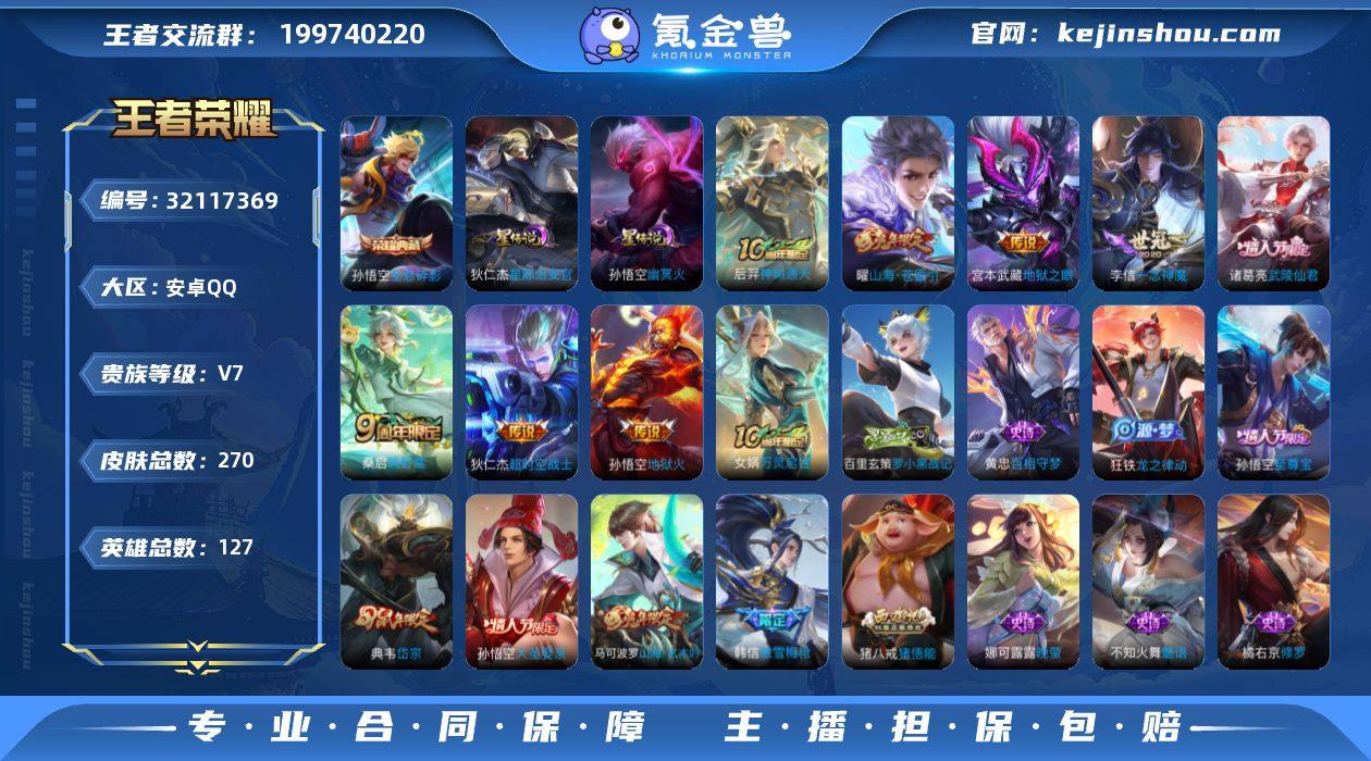 V7 1典藏 8传说 2星元 270皮肤 127英雄 【1水晶】孙悟空-全息碎影【8传说】曜-山海·苍雷引,狄仁杰-超时空战士,宫本武藏-地狱之眼,李信-一念神魔,孙悟空-地狱火,诸葛亮-武陵仙君,桑启-鸣野蒿,后羿-神树通天【2星元】狄仁杰-星际治安官,孙悟空-幽冥火【72史诗】元歌-无心,上官婉儿-神器·万象笔,鬼谷子-五谷丰年,赵云-未来纪元,钟无艳-超时空战士,狂铁-电玩高手,明世隐-吟游魔法,阿轲-节奏热浪,安琪拉-心灵骇客,白起-星夜王子,百里守约-特工魅影,不知火舞-魅语,曹操-幽灵船长,程咬金-功夫厨神,妲己-女仆咖啡,妲己-魅力维加斯,大乔-猫狗日记,狄仁杰-魔术师,狄仁杰-鹰眼统帅,典韦-岱宗,貂蝉-圣诞恋歌,伽罗-箭羽风息,宫本武藏-鬼剑武藏,韩信-白龙吟,韩信-傲雪梅枪,花木兰-水晶猎龙者,橘右京-修罗,黄忠-火炮绅士,铠-曙光守护者,兰陵王-暗隐猎兽者,李白-千年之狐,李元芳-逐浪之夏,刘邦-德古拉伯爵,刘禅-天才门将,露娜-紫霞仙子,吕布-圣诞狂欢,吕布-末日机甲,墨子-金属风暴,娜可露露-晚萤,裴擒虎-李小龙,司马懿-暗渊魔法,孙策-猫狗日记,孙尚香-水果甜心,孙悟空-大圣娶亲,孙尚香-时之恋人,孙悟空-至尊宝,王昭君-偶像歌手,夏侯惇-乘风破浪,小乔-缤纷独角兽,雅典娜-冰冠公主,雅典娜-黎明之约,亚瑟-心灵战警,嬴政-摇滚巨星,张飞-乱世虎臣,赵云-皇家上将,赵云-龙胆,甄姬-冰雪圆舞曲,诸葛亮-黄金分割率,猪八戒-猪悟能,庄周-高山流水,暃-星界游侠,梦奇-顽趣,鲁班七号-蔬乡物语,马可波罗-山海·玄木吟,镜-青焰无极,蒙犽-百解令,蒙恬-荣光圣徽,百里守约-百相守梦,狂铁-龙之律动,黄忠-百相守梦,女娲-万灵启世,百里玄策-罗小黑战记