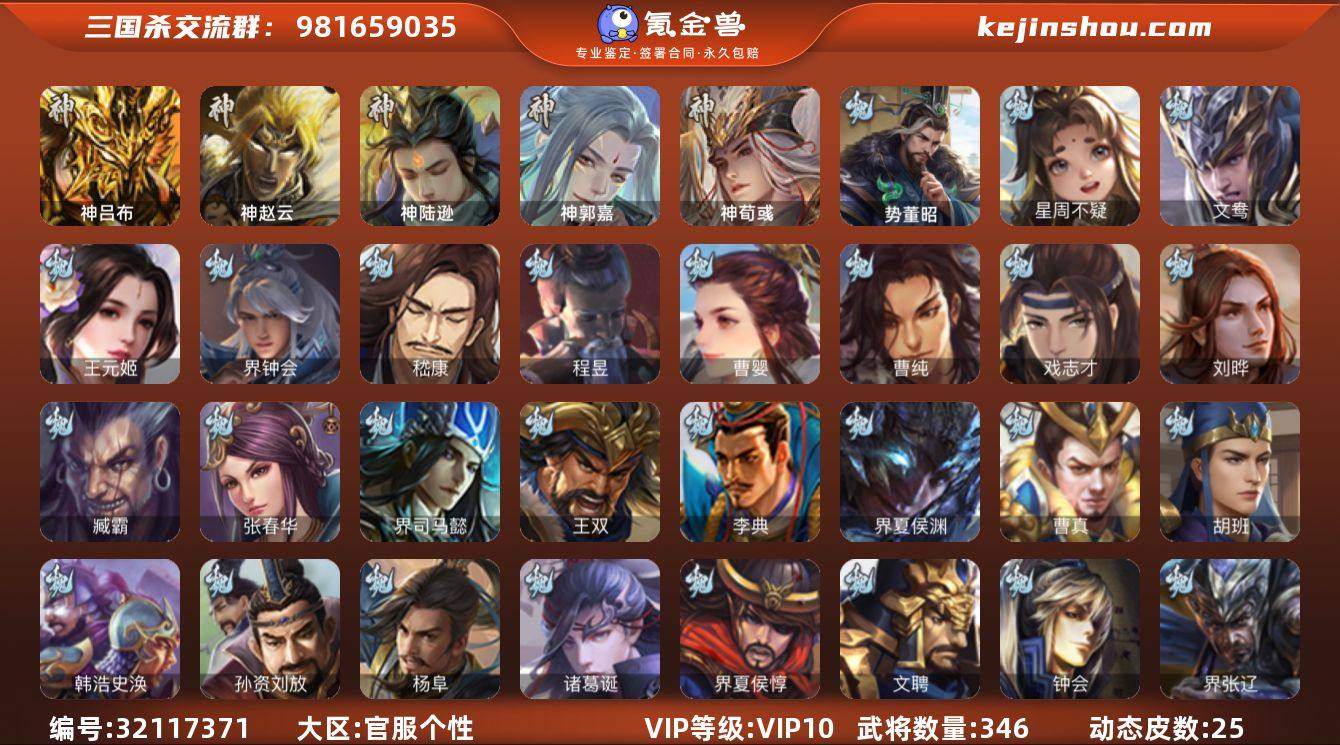 【2663】官阶:大将军;VIP等级:VIP10;史诗武将数量:40;动态皮肤数量:25;武将总数:346;史诗宝珠数量:0;将魂数量:4660;神将:5;魏国史诗武将:14;蜀国史诗武将:7;吴国史诗武将:9;群史诗武将:10 神吕布,神赵云,神陆逊,神郭嘉,神荀彧,星周不疑,王元姬,界钟会,嵇康,曹婴,曹纯,戏志才,刘晔,势董昭,程昱,谋赵云,赵襄,沙摩柯,谯周,傅佥,花鬘,董允,周处,孙寒华,骆统,留赞,界徐盛,贺齐,势太史慈,文鸯,左慈,张让,星甘宁,麹义,庞德公,刘焉,界李儒,公孙康,谋张角,兀突骨,SP关羽,SP蔡文姬,乐进,曹昂,诸葛诞,朱灵,文聘,SP姜维,张春华,钟会,曹冲,郭淮,满宠,界王异,界曹操,界司马懿,界夏侯惇,界张辽,界许褚,界郭嘉,李典,曹真,韩浩史涣,陈群,曹叡,曹休,钟繇,司马朗,王基,李通,郭皇后,孙资刘放,辛宪英,界甄姬,吕虔,鲁芝,界典韦,界荀彧,杜畿,毌丘俭,界邓艾,张恭,贾逵,界曹植,界满宠,卞夫人,华歆,蔡贞姬,袁涣,王双,崔琰,杨阜,谋于禁,牵招,胡班,界夏侯渊,臧霸,SP孙尚香,夏侯霸,马良,关兴张苞,廖化,界马岱,关平,简雍,刘封,界法正,界关兴张苞,界刘备,界关羽,界张飞,界赵云,SP徐庶,吴懿,周仓,张松,刘谌,夏侯氏,糜竺,马忠,李严,黄皓,吴苋,秦宓,界黄月英,界诸葛亮,赵统赵广,严颜,界伊籍,界卧龙诸葛,界庞统,界孟获,界祝融,界刘禅,张翼,杨仪,邓芝,傅肜,糜夫人,界周仓,刘巴,彭羕,谋庞统,界张嶷,谋张飞,霍峻,诸葛果,蒋琬费祎,糜芳傅士仁,甘夫人,鲁肃,孙茹,凌操,大乔小乔,诸葛恪,诸葛瑾,孙鲁育,程普,韩当,潘璋马忠,虞翻,朱然,界甘宁,界吕蒙,界黄盖,界周瑜,界大乔,界陆逊,孙鲁班,朱桓,顾雍,孙休,朱治,全琮,孙登,岑昏,徐氏,薛综,界孙权,界孙尚香,潘濬,孙亮,严畯,吕岱,周鲂,界孙策,卫温诸葛直,界韩当,界虞翻,界潘璋马忠,孙邵,桥公,张温,蒋钦,吕范,界顾雍,界孙鲁班,谋韩当,谋吕蒙,谋甘宁,谋周瑜,界孙休,界全琮,界朱治,张布,友庞统,蔡文姬,伏完,...