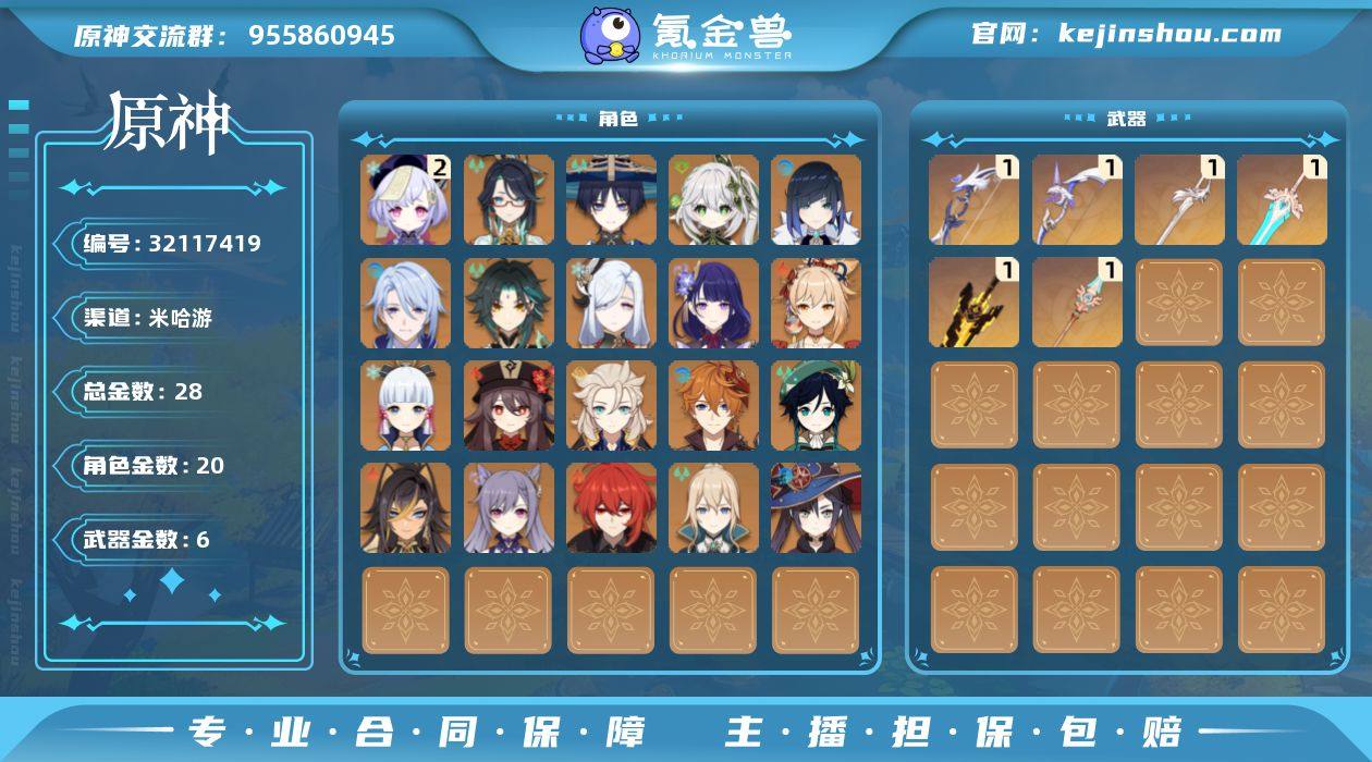 56级/28黄/女主/20个五星角色/6个五星武器 0命闲云,0命迪希雅,0命流浪者,0命纳西妲,0命夜兰,0命神里绫人,0命申鹤,0命雷电将军,0命神里绫华,0命胡桃,0命魈,0命宵宫,0命温迪,0命达达利亚,0命阿贝多,0命刻晴,2命七七,0命琴,0命莫娜,0命迪卢克,精1若水,精1无工之剑,精1天空之脊,精1阿莫斯之弓,精1风鹰剑,精1天空之傲