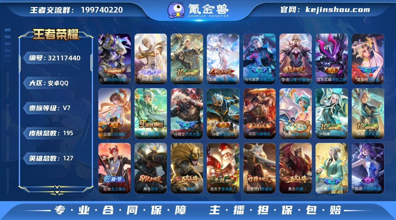 V7 1典藏 1无双 10传说 195皮肤 127英雄 【1水晶】铠-银白咏叹调【1无双】孙悟空-无相【10传说】孙悟空-齐天大圣,李信-山海·炽霜斩,马可波罗-深海之息,宫本武藏-地狱之眼,孙策-末日机甲,夏洛特-浮生妄,桑启-鸣野蒿,云缨-幻光神枪,女娲-愿照·千秋盛,后羿-神树通天【54史诗】元歌-无心,鬼谷子-五谷丰年,赵云-未来纪元,金蝉-唐三藏,夏洛特-永昼,白起-星夜王子,百里守约-特工魅影,百里守约-朱雀志,百里玄策-原初追逐者,曹操-幽灵船长,妲己-女仆咖啡,妲己-魅力维加斯,大乔-猫狗日记,狄仁杰-魔术师,狄仁杰-鹰眼统帅,典韦-岱宗,貂蝉-圣诞恋歌,宫本武藏-鬼剑武藏,花木兰-水晶猎龙者,黄忠-烈魂,铠-曙光守护者,兰陵王-暗隐猎兽者,老夫子-圣诞老人,李白-千年之狐,李元芳-逐浪之夏,廉颇-地狱岩魂,刘邦-德古拉伯爵,鲁班七号-电玩小子,吕布-圣诞狂欢,吕布-末日机甲,马超-神威,墨子-金属风暴,哪吒-逐梦之翼,司马懿-暗渊魔法,孙策-猫狗日记,孙尚香-水果甜心,王昭君-偶像歌手,西施-诗语江南,夏侯惇-乘风破浪,小乔-缤纷独角兽,亚瑟-心灵战警,嬴政-摇滚巨星,嬴政-暗夜贵公子,赵云-皇家上将,甄姬-冰雪圆舞曲,诸葛亮-黄金分割率,庄周-高山流水,赵怀真-器灵·浮梦炉,狄仁杰-绮世丹青,狂铁-龙之律动,小乔-线条小狗,项羽-九幽镇关,少司缘-巫礼祀神,女娲-万灵启世
