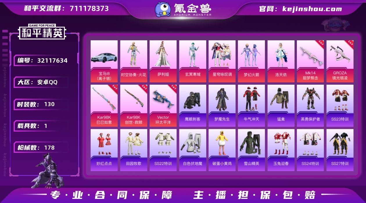 【ky193】安卓 手Q-8粉装-6特效枪-0载具-2粉色飞行器-68658热力值-4王牌印记-190套装-238枪皮 【热门品类】:套装-都市猎人,套装-小丑鱼,套装-龟仙人 【粉色套装】:粉装-星之彼岸,角色-洛天依,粉装-橘柚倾心,粉装-赤焰黑爵,粉装-霞光圣骑,粉装-仲夏莫吉托,粉装-炫光之旅,粉装-幻彩电音 【粉色枪皮等级】:M416-电玩时刻(五级),GROZA-镜光银凌(五级),AUG-暖羊咩咩(五级),AKS-74U-星穹咏叹调(七级),Kar98K-巳巳如意(五级),DP-28-豹影疾电(五级) 【粉色枪皮】:M416-电玩时刻,GROZA-镜光银凌,AUG-暖羊咩咩,AKS-74U-星穹咏叹调,Kar98K-巳巳如意,DP-28-豹影疾电 【粉色飞行器】:星夜魔法师飞行翼 【粉色降落伞】:幻影战神降落伞,洛神天依降落伞,天之羽翼降落伞,环太平洋降落伞,垂柳戏鸭降落伞,音爆索尼克降落伞,圣堂之誓降落伞,冠军兔兔降落伞,忍者神龟降落伞,动力核心降落伞,鬼刀降落伞,幻星舰长降落伞,异瞳寒姬降落伞,极意拳锋降落伞,炫彩糖果降落伞 【稀有套装】:套装-龟仙人,套装-巳巳如意,套装-荒原牛仔,套装-雪国风尚,套装-火种守卫者,套装-糖糖葫芦,套装-青团波波,套装-燕燕于飞,套装-鱼渊荷华,套装-迷雾之月,角色-海琴烟,套装-霓虹热舞,套装-彩虹兔,套装-云朵鹅,套装-雪绒豹,角色-夜瞳黯灵,角色-绯色魅影,套装-书海巡游,套装-画境星梦,套装-琴音绮想,套装-钻光豹影 【稀有枪皮】:AKM-墨染幽兰,AKM-彩虹符号,AKM-灼热熔岩,AKM-破晓战魂,AKM-霓虹街区,AKM-龙的传人,AKM-极光猎影,M16A4-幻世战舞者,M16A4-甜心亚梦,M16A4-红色方程式,M16A4-蓝色火焰,SCAR-L-夜灯,SCAR-L-炫彩节奏,SCAR-L-玉兔迎春,SCAR-L-红色方程式,SCAR-L-银碳小老虎,M416-糯团青竹,M416-紫翼圣骑,M416-红色方程式,M416-蓝色火焰,GROZA-异彩先驱,GROZA-彩虹符号...