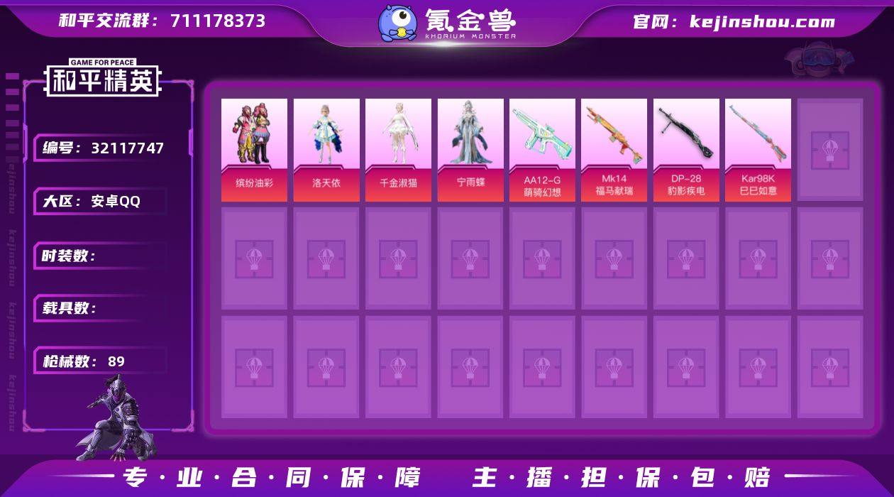 安卓 手Q-8粉装-5特效枪-0载具-58839热力值-8印记-140套装-169枪皮 【特效枪等级】:AKM-绿萝繁花(五级),SCAR-L-青春物语(七级),M416-电玩时刻(五级),AUG-暖羊咩咩(五级),Kar98K-巳巳如意(一级) 【优质套装】:粉装-PEL轰鸣竞梦者,粉装-酣梦娃娃,粉装-岚岚物语,粉装-海盐物语,粉装-橘柚倾心,粉装-霓裳武神,粉装-仲夏莫吉托,角色-萨利娅 【稀有套装】:套装-龟仙人,套装-青团波波,套装-燕燕于飞,套装-鱼渊荷华,角色-风玲,套装-晶辉守护,套装-闪电轻猫 【优质武器皮肤】:AKM-绿萝繁花,SCAR-L-青春物语,M416-电玩时刻,AUG-暖羊咩咩,Kar98K-梦幻火箭,Kar98K-巳巳如意 【稀有武器皮肤】:AKM-彩虹符号,AKM-恐龙拽拽,AKM-春暖花开,AKM-破晓战魂,AKM-缤纷海域,AKM-霓虹街区,AKM-龙的传人,M16A4-甜心亚梦,SCAR-L-炫彩节奏,SCAR-L-玉兔迎春,SCAR-L-粉色回忆,M416-滑板小狐,M416-糯团青竹,M416-红色方程式,M416-绯红前夜,M416-蓝色火焰,GROZA-治愈之星,GROZA-蓝莓炮弹,AUG-天降萌叽,AUG-耀粉歌者,QBZ-原初圣火,QBZ-飞驰魅影,M762-拳皇97,M762-深海曼妙,M762-瑞龙福将,M762-第五大道,Mk47-妙红点点,Mk47-林间仙鹿,Mk47-洛神天依,Mk47-粉色回忆,AC-VAL-天降萌叽,AC-VAL-彩虹甜喵,AC-VAL-甜心亚梦,蜜獾-垂柳戏鸭,蜜獾-娇憨猪猪,UZI-众神之王,UZI-啾咪啾咪,UZI-娇憨猪猪,UZI-炫彩节奏,UMP45-涂山之恋,UMP45-生命誓言,Vector-彩虹符号,Vector-暗夜玫瑰,Vector-治愈之星,Vector-生命誓言,汤姆逊-勇闯险境,汤姆逊-天降萌叽,汤姆逊-耀粉歌者,MP5K-众神之王,AKS-74U-鬼刀,P90-飞驰魅影,Kar98K-勇闯险境,Kar98K-彩虹符号,Kar98K-梦幻火箭,Kar98K-深海曼妙,Kar98K-飞驰魅影,M24-治愈之星,M24-炫彩节奏,M24-百合蜜语,M24-众神之王,AWM-垂柳戏鸭,SK...