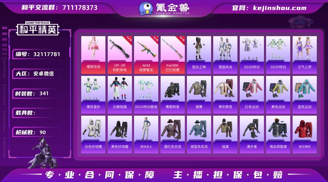 实名: 可修改 时装数: 341 枪械数: 90 热门装扮: 鹰眼刺客,樱桃泡泡 稀有枪皮: AKM绿萝繁花,Kar98K-巳巳如意,DP-28-豹影疾电 亮点: 【优质装备】:Mark.06(新蓝螳螂)