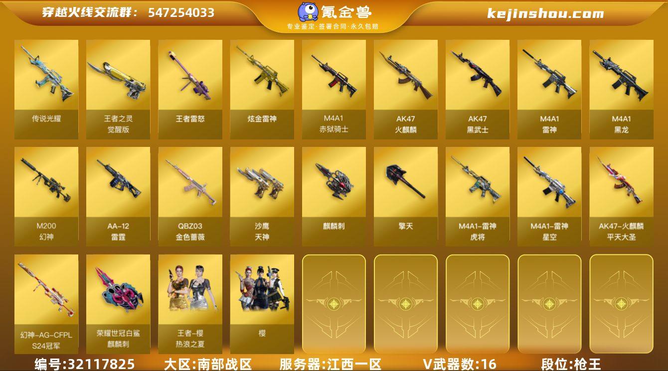江西一区-17V-4王者-1炫金 【传说武器】:传说光耀 【热门武器】:传说光耀,QBZ03-金色蔷薇,M200-幻神 【王者炫金武器】:王者雷怒,炫金雷神 【音效卡】:Barrett-极光音效卡 【皮肤】:幻神-AG-CFPL S24冠军 皮肤,雷神-星空,雷神-虎将,火麒麟-平天大圣,麒麟刺-荣耀世冠白鲨 【角色】:樱,王者樱-热浪之夏,风暴女,嘉年华灵狐,曼陀罗-X,斯沃特-X,兔囡囡 【人偶武器】:深渊终结者手雷 【暴走生化】:超级对讲机 【挑战大师】:阐释者III 【英雄级武器】:AK47-火麒麟,M4A1-黑龙*2,M4A1-雷神,AK47-黑武士*3,QBZ03-金色蔷薇,白虎之魄-觉醒版,M200-幻神,AA-12-雷霆,沙鹰-天神,王者之灵-觉醒版,擎天*2,麒麟刺,M4A1-赤狱骑士 【道具】:CFS限定背包,亚洲杯纪念炫彩背包,战舰背包,女皇终结者-魔龙之吻,绿色巨人,灵魂忍者,迷雾幽灵,夺命之镰,防化服*2,金色流光-枪王排位*2,星辰流光-枪王排位,巅峰赛先锋-金色流光,枪王排位28赛季金色流光,枪王排位29赛季金色流光,防弹头盔*2,防弹衣*2,C4工具钳*2,手雷包*2 【特殊枪械】: