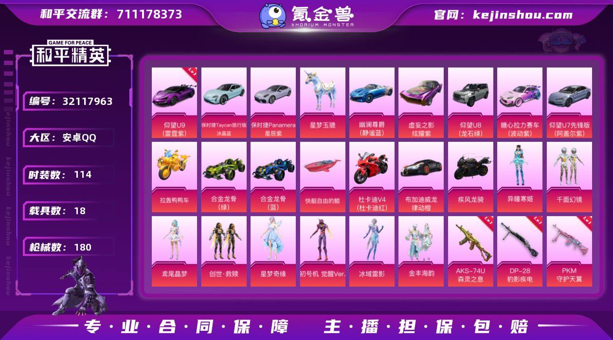 【AUG星梦奇缘 3级升级车螳螂19载具11特效枪9粉装素材号 秒换绑不用等】 安卓Q区-78533热力值-7印记-114套装-180枪皮 【19载具】 仰望U9(雷霆紫)(3级) 路特斯EL蓝色 路特斯EV黄色 合金龙骨蓝色 合金龙骨绿色 杜卡迪 Panigale V4(杜卡迪红) 拉轰鸭鸭车 自由的鲸(1级) 萌兔起飞僚机 仰望U8(龙石绿) 仰望U7先锋版(阿盖尔紫) 糖心拉力赛车(波动紫) 虚妄之影(炫耀紫) 星梦玉骢 疾风龙骑 幽澜尊爵(静谧蓝) 保时捷Taycan 旅行版(冰晶蓝) 布加迪威龙(律动橙) 保时捷Panamera(星辰紫)【2稀有】 Mark.06蓝螳螂 8号机粉螳螂【9粉装】 角色-初号机 觉醒Ver. 虹云熊熊 千面幻镜(假木乃伊) 创世·救赎 角色-冰域雷影 角色-星梦奇缘 角色-鸢尾晶梦 角色-异瞳寒姬 金丰海韵【11特效枪】 AUG-星梦奇缘(3级) M416-墨龙九天(3级) M200-梦海之灵(3级) AKM-魔法神域(3级) AKS-74U-森灵之息(5级) Mk14-福马献瑞(5级) PKM-守护天翼(4级) Kar98K-创世·救赎(7级) Kar98K-巳巳如意(5级) M416-电玩时刻(5级) DP-28-豹影疾电(5级)【219热门】 破蛋小黄鸡 英勇保护者 冰公主 SS26特训 SS25特训 SS23特训 SS22特训 Mk47-洛神天依 SCAR-L-玉兔迎春 M762-天降萌叽 M762-彩虹符号 Mk47-乌木金纹 M249-彩虹符号 M416-蓝色火焰 GROZA-彩虹符号 长空猛禽 魅力单车 竞技达人朋克 黑色伏地魔 海岛探路者 纯真浪花 短管霰弹-宇宙意志 S1897-糯团青竹 创世·幻影 AA12-G-雨过天青 沙漠之鹰-雨过天青 平底锅-画境星梦 P90-紫矿核心 M16A4-雨过天青 顶瓜瓜 SPAS-12-福马献瑞 诡诞巡游 M249-无面战甲 雨过天青 冰河战士 雏菊兔兔 MG-36-薄荷星砂 GROZA-福马献瑞 SS34特训 达芬奇 朱霞炽焰 DBS-创世·救赎 创世·