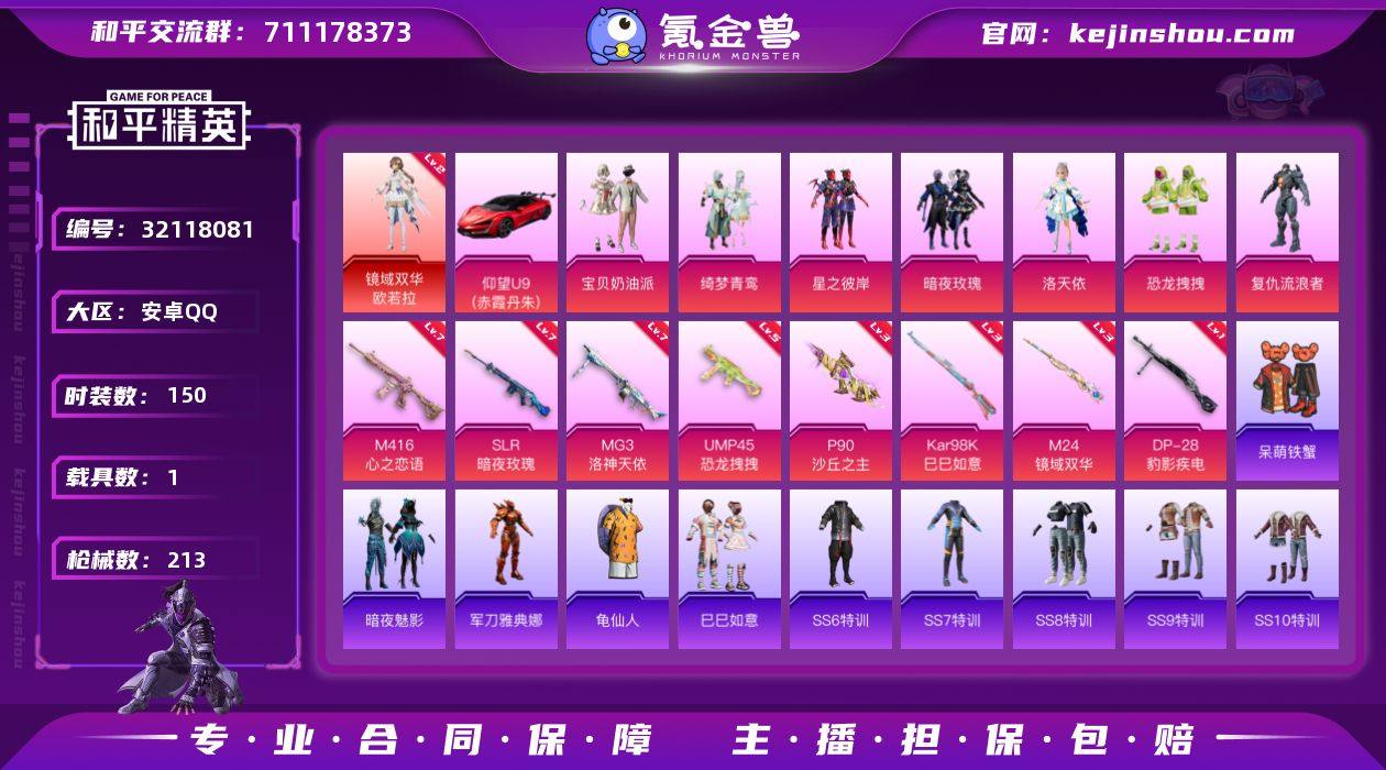安卓【极品神装号 镜域双华-欧若拉(二级)/角色-洛天依/M416-心之恋语(七级)/P90-沙丘之主(三级)/仰望U9(赤霞丹朱)】 手Q-1神装-7粉装-8特效枪-1载具-4粉色飞行器-77310热力值-10王牌印记-150套装-213枪皮 【红色神装等级】:镜域双华-欧若拉(二级) 【红色角色神装】:镜域双华-欧若拉 【热门品类】:角色-军刀雅典娜,套装-龟仙人 【粉色套装】:粉装-宝贝奶油派,粉装-绮梦青鸾,粉装-星之彼岸,粉装-暗夜玫瑰,角色-洛天依,粉装-恐龙拽拽,角色-复仇流浪者 【粉色枪皮等级】:M416-心之恋语(七级),UMP45-恐龙拽拽(五级),P90-沙丘之主(三级),Kar98K-巳巳如意(三级),M24-镜域双华(三级),SLR-暗夜玫瑰(七级),DP-28-豹影疾电(一级),MG3-洛神天依(七级) 【粉色载具】:仰望U9(赤霞丹朱) 【粉色枪皮】:M416-心之恋语,UMP45-恐龙拽拽,P90-沙丘之主,Kar98K-巳巳如意,M24-镜域双华,SLR-暗夜玫瑰,DP-28-豹影疾电,MG3-洛神天依 【粉色飞行器】:深海曼妙飞行器,绮梦青鸾飞行器,沙丘之主天马,镜域双华-灵镜之阶 【粉色降落伞】:幻影战神降落伞,春暖花开降落伞,神秘黑猫降落伞,潮汐统领降落伞,银刃赛罗降落伞,香水柠檬降落伞,绮梦青鸾降落伞,怪笑疯兔降落伞,暗夜玫瑰降落伞,齐天大圣降落伞,洛神天依降落伞,海渊国主降落伞,恐龙拽拽降落伞,庄周梦蝶降落伞,环太平洋降落伞,彩虹甜喵降落伞,沙丘之主降落伞,镜域双华降落伞,精灵梦叶罗丽降落伞,创世·救赎降落伞,炫彩糖果降落伞 【稀有套装】:套装-龟仙人,套装-巳巳如意 【稀有枪皮】:AKM-彩虹符号,AKM-影袭,AKM-恐龙拽拽,AKM-灼热熔岩,AKM-环太平洋,AKM-萌趣颜团子,AKM-虎虎生威,AKM-霓虹街区,M16A4-夜灯,M16A4-幻世战舞者,M16A4-甜心亚梦,SCAR-L-夜灯,SCAR-L-暗夜玫瑰,SCAR-L-炫彩节奏,SCAR-L-玉兔迎春,SCAR-L-红...