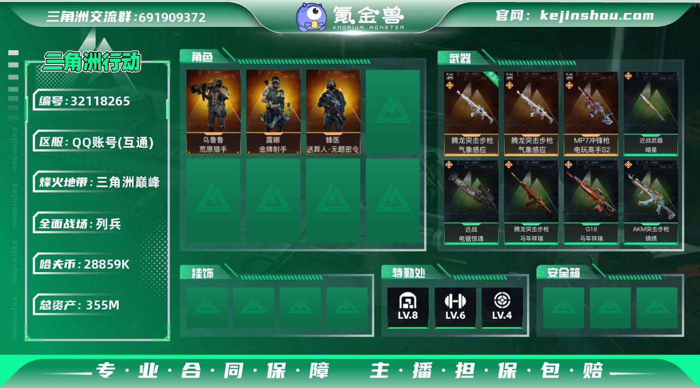 QQA90/可二次/QQ区【356.4M总资产】+【腾龙突击步枪-气象感应(毒性优品c)+【MP7冲锋枪-电玩高手S2(优品c)+【近战-暗星-处刑者-电锯惊魂】+S8赛季安全箱3*3+24发AWM子弹】/烽火等级:60级/全面战场:10级/纯币:28859K/三角券加币:1360(三角币1360+三角券0)【峰医-送葬人】【乌鲁鲁-荒原猎手】【露娜-金牌射手】/部门:22322/特勤等级(技术中心满级/工作台满级/制药台满级/防具台满级/仓库8级/指挥中心5级/训练中心6级/靶场4级/潜水中心2级/收藏室1级)(流动资产:144.7M)---(锦绣+鹅鸭杀+捞点薯条+特拉斯线圈+马年祥瑞+缄花+暗星)捆绑包---/SCAR-H战斗步枪-启航/M4A1突击步枪-阿米娅/勇士冲锋枪-能天使-午夜邮/腾龙突击步枪-捞点薯条/AWM狙击步枪-捞点薯条/R93狙击步枪-维什戴尔/CAR-15突击步枪-阿米娅/复合弓-黑-天际线/11橙色挂饰/段位:三角洲巅峰/详细看图