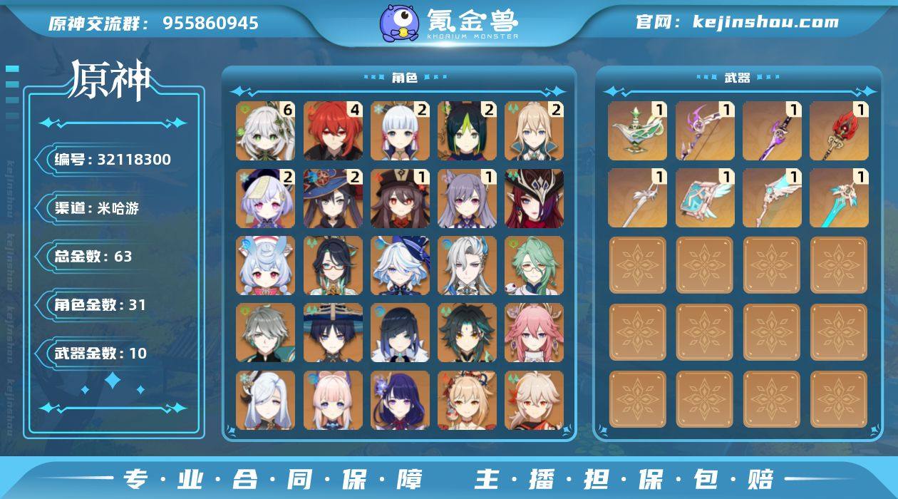 【店主推荐捡漏号】60级/63黄/男主/31个五星角色/10个五星武器 0命希格雯,0命闲云,0命芙宁娜,0命那维莱特,0命白术,0命迪希雅,0命艾尔海森,0命流浪者,满命纳西妲,2命提纳里,0命夜兰,0命八重神子,0命申鹤,0命雷电将军,0命枫原万叶,2命神里绫华,0命钟离,1命胡桃,0命魈,0命宵宫,0命温迪,0命可莉,0命珊瑚宫心海,1命刻晴,2命七七,2命琴,2命莫娜,4命迪卢克,0命恰斯卡,0命奈芙尔,0命杜林,精1千夜浮梦,精1飞雷之弦振,精1雾切之回光,精1护摩之杖,精1天空之翼,精1天空之刃,精1天空之卷,精1风鹰剑,精1血染荒城