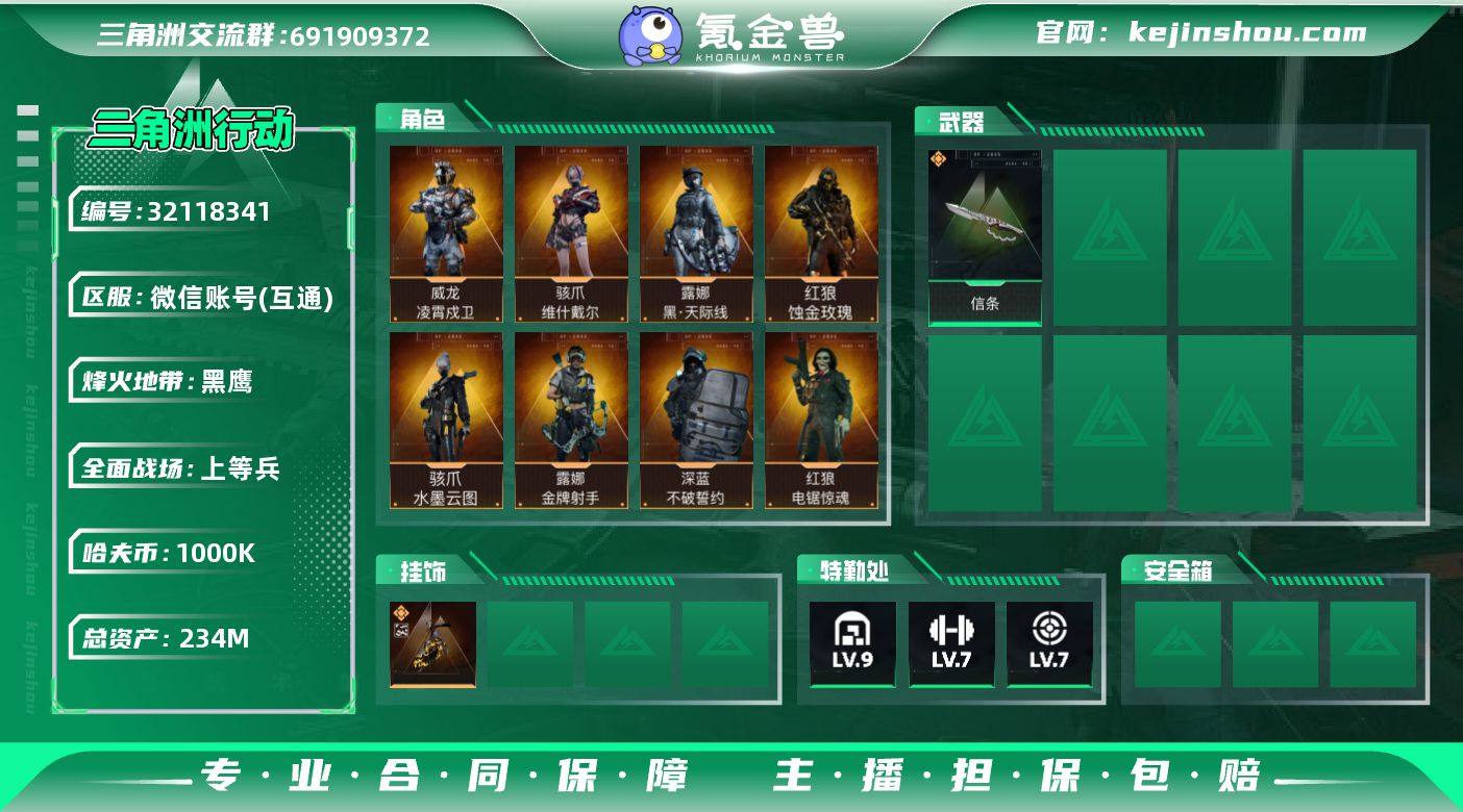 实名:可二次实名 总资产:234M 哈夫币:1000K 烽火地带段位:黑鹰 烽火地带等级:60 全面战场段位:上等兵 全面战场等级:60 9级仓库,7级训练中心,7级靶场,1级潜水中心,1级收藏室 战术部门等级:4 战斗部门等级:4 医疗部门等级:4 研发部门等级:4 后勤部门等级:4