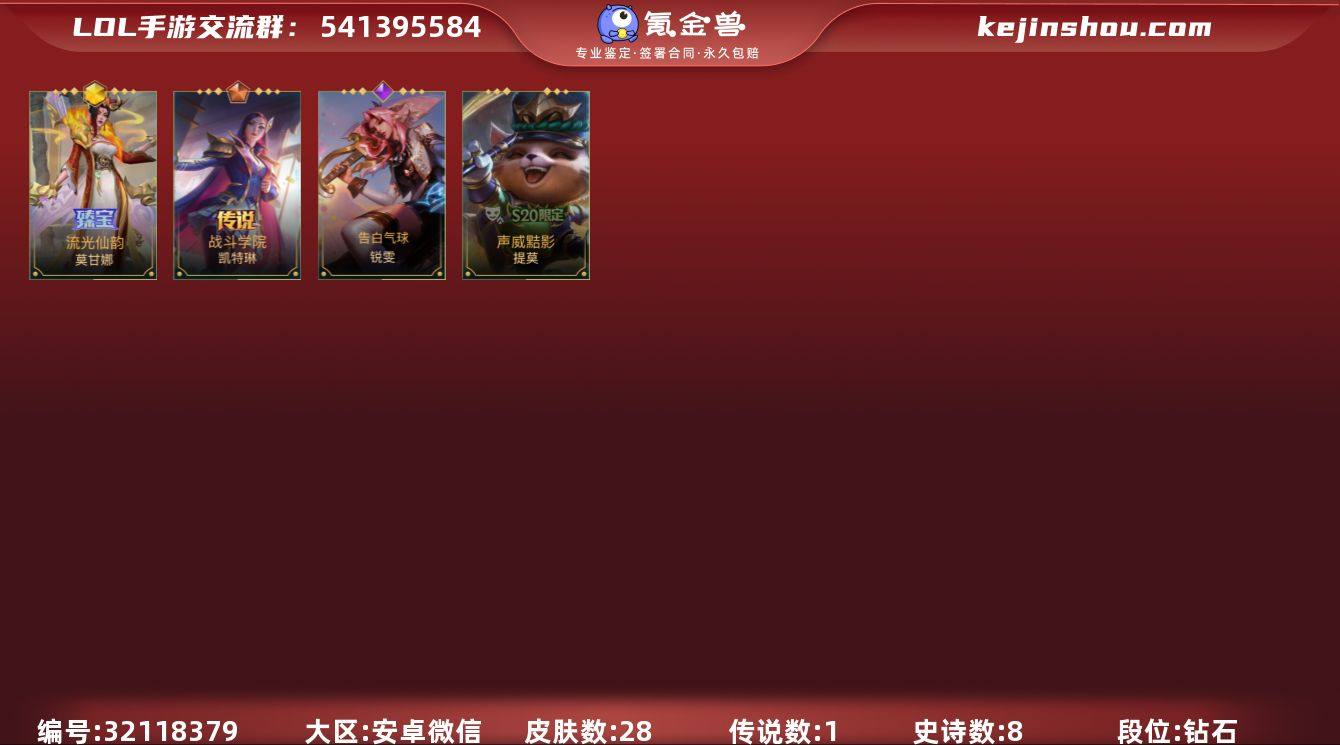 实名:可二次实名 段位:钻石 英雄数:30 皮肤数:28 神话皮肤数量:1 传说皮肤数量:1 终极数:0 典藏皮肤数量:0 流光仙韵 莫甘娜 战斗学院女警 告白气球 锐雯 声威黠影 提莫 卖家说:诚心出售,可二次实名。