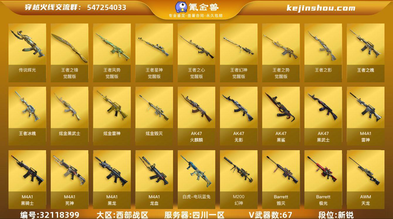 四川一区-76V-9王者武器数-3炫金武器数 【传说武器】:传说辉光 【热门武器】:传说辉光,QBZ03-金色蔷薇,M14EBR-玄武,Scar Light-白虎,HK417-朱雀,M200-幻神,死亡之眼*6,白虎-电玩蓝兔,柯尔特-冠军之特,Kar98K-星神,M4A1-黑骑士*2,汤姆逊-烈龙*6,RPK-盘龙*6,加特林-炼狱,降世魔童,沙鹰-修罗*2,Knife-冠军之刃 【王者炫金武器】:王者冰魄,王者之影,王者之魄,炫金雷神,炫金武士,炫金毁灭 【音效卡】:M200-幻神音效卡,M4A1-雷神音效卡,M4A1-黑骑士音效卡,Barrett-毁灭音效卡 【皮肤】:幻神-CFS2022,QBZ03-冠军之薇,雷神-荣耀之魄,雷神-星空,雷神-虎将,雷神-冠军之魄,雷神-传奇N9,火麒麟-雷神,火麒麟-轻羽皮肤,毁灭-英雄计划 皮肤,黑龙-暗月,黑龙-冠军之武,黑骑士-冠军之势,无影耀金皮肤,AK47-黑武士-361,战神-紫绶金章皮肤*2,战神-流金岁月皮肤*2,AK47-B-常胜将军-曹操,极光-能量核心,修罗-星空,屠龙-荣耀之锋 【角色】:葵,雨棠,鹰,王者春,王者-魅影,空,娟娟,龙儿,潘多拉-X,潘多拉-甜心教官,铁骑荣耀,影武者-X 【人偶武器】:黄金迷你裂空之翼,迷你波特博士*5,夺魂,迷你火种*3,迷你生化手雷,迷你超能女侍,降世魔童 【暴走生化】:死亡之眼*6 【挑战大师】:冰龙粉碎者-白马银枪,激光毁灭者III,试炼破坏者III,神圣爆裂者-末日III 【英雄级武器】:AK47-火麒麟,M4A1-黑龙,M4A1-雷神,M4A1-黑骑士*2,AK47-无影,M4A1-死神,AK47-黑武士*3,AK12-天启,AN94-超新星,AK47-黑鲨,M4A1-龙血*2,HK417-朱雀,Scar Light-白虎,M14EBR-玄武,QBZ03-金色蔷薇,9A91-烈火,王者之心-觉醒版,王者之势-觉醒版,AK-47-猩红传说,王者风势-觉醒版,白虎-电玩蓝兔,AWM-天龙,Barrett-毁灭,Barrett-极光,AWM-裁决,M200-幻神,Kar98K-星神,Barrett-金色...