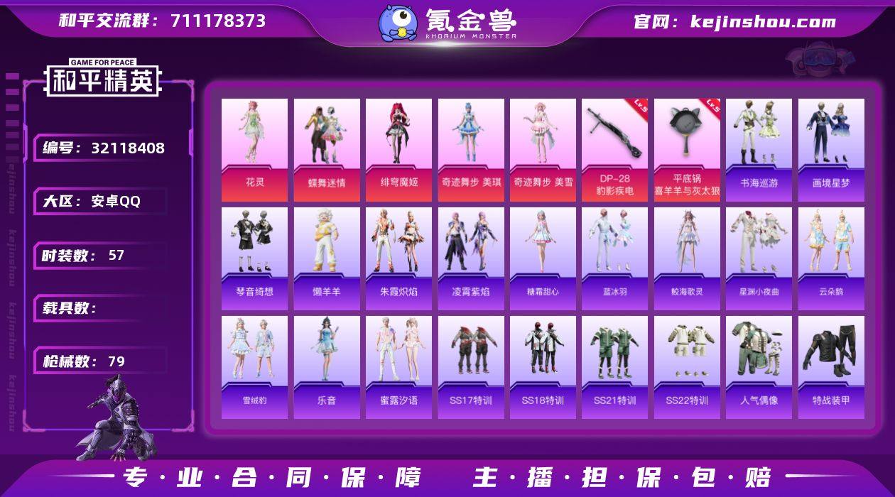 【AZH2990】安卓 手Q【无敌战神框 奇迹舞步 美琪美雪 暖暖麦兜 满级平底锅-喜羊羊与灰太狼】无敌战神框-5粉装-4特效枪-0载具-1粉色飞行器-26807热力值-5王牌印记-57套装-79枪皮 【粉色套装】:粉装-蝶舞迷情,角色-绯穹魔姬,角色-奇迹舞步 美琪,角色-奇迹舞步 美雪,角色-花灵 【粉色枪皮等级】:ACE32-萌骑漫游(五级),Mk14-福马献瑞(五级),DP-28-豹影疾电(五级),平底锅-喜羊羊与灰太狼(七级) 【粉色枪皮】:ACE32-萌骑漫游,Mk14-福马献瑞,DP-28-豹影疾电,平底锅-喜羊羊与灰太狼 【粉色飞行器】:炫彩糖果飞行器 【粉色降落伞】:第五大道降落伞,绝色倾城降落伞,绯果甜心降落伞,星穹咏叹调降落伞,冷漠罗丽降落伞,智趣喵喵降落伞,喜羊羊与灰太狼降落伞,异瞳寒姬降落伞,炫彩糖果降落伞 【稀有套装】:套装-雪国风尚,套装-暖暖麦兜,套装-马上来财,角色-糖霜甜心,套装-蓝冰羽,角色-鲛海歌灵,套装-星渊小夜曲,套装-云朵鹅,套装-雪绒豹,角色-乐音,套装-蜜露汐语,套装-朱霞炽焰,套装-凌霄紫焰,玩偶服-懒羊羊,套装-书海巡游,套装-画境星梦,套装-琴音绮想,套装-雨过天青,套装-红釉青花 【稀有枪皮】:AKM-春暖花开,SCAR-L-玉兔迎春,SCAR-L-冷漠罗丽,M762-云朵鹅,ACE32-画境星梦,ARX-凌霄紫焰,UMP45-海渊国主,汤姆逊-耀粉歌者,MP5K-画境星梦,JS9-凌霄紫焰,M24-樱桃泡泡,AMR-喜羊羊与灰太狼,MK20-H-樱桃泡泡,SVD-云朵鹅,SVD-冷漠罗丽,M1加兰德-画境星梦,S1897-荧海星豚,S12K-破晓战魂,AA12-G-画境星梦,SPAS-12-云朵鹅,M249-彩虹符号,M249-糯团青竹,MG3-幻世战舞者,MG-36-绯果甜心,MG-36-凌霄紫焰,P92-凌霄紫焰,短管霰弹-星穹咏叹调,信号枪-奇迹舞步,沙漠之鹰-云朵鹅,大砍刀-云朵鹅,撬棍-冷漠罗丽,平底锅-凌霄紫焰,平底锅-画境星梦 【其他套装】:套装-SS1...