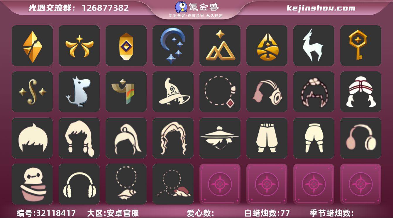 11季透明蝶翼姆明鲲灯巫师小狗头饰多季节编号:YXB8105 区服:安卓 翼数量:146资源:蜡烛77 爱心6 红4已毕业地图: 晨岛 雨林 霞谷 暮土毕业季节:破晓季 欧若拉季 追忆季 夜行季 拾光季 归巢季 九色鹿季 筑巢季 二重奏季 姆明季 彩染季 热门礼包:奥利奥头饰 彩虹耳机 彩虹耳钉 巫师帽 冲浪 祥云伞 雪花 橘子 玉兔 心心相印 四叶草 热门活动复刻:武士裤 白棉裤 绒边棉裤 灯笼棉裤 紧身棉裤 星星眼镜 贴符面饰 毛绒领子 海龟肩饰 海螺项链 宴会围巾 粗辫发型 公主头 高马尾 偏分脏辫 正太 书虫 箬笠 明制大帽 郡主头 疯帽匠发型 三月兔发型 虚荣 军帽 猫猫头 樱花头 热心指路帽 小鼠标 红色耳机 二级白斗 二级蓝斗 落紫斗 樱花斗 马蹄莲斗 彩虹斗暗彩斗 海浪斗 鱼纹斗 水波斗 炼药锅 三丽鸥茶杯浴缸 大耳狗点心桌 堆雪桶 女巫茶桌",晨岛,雨林,霞谷,暮土