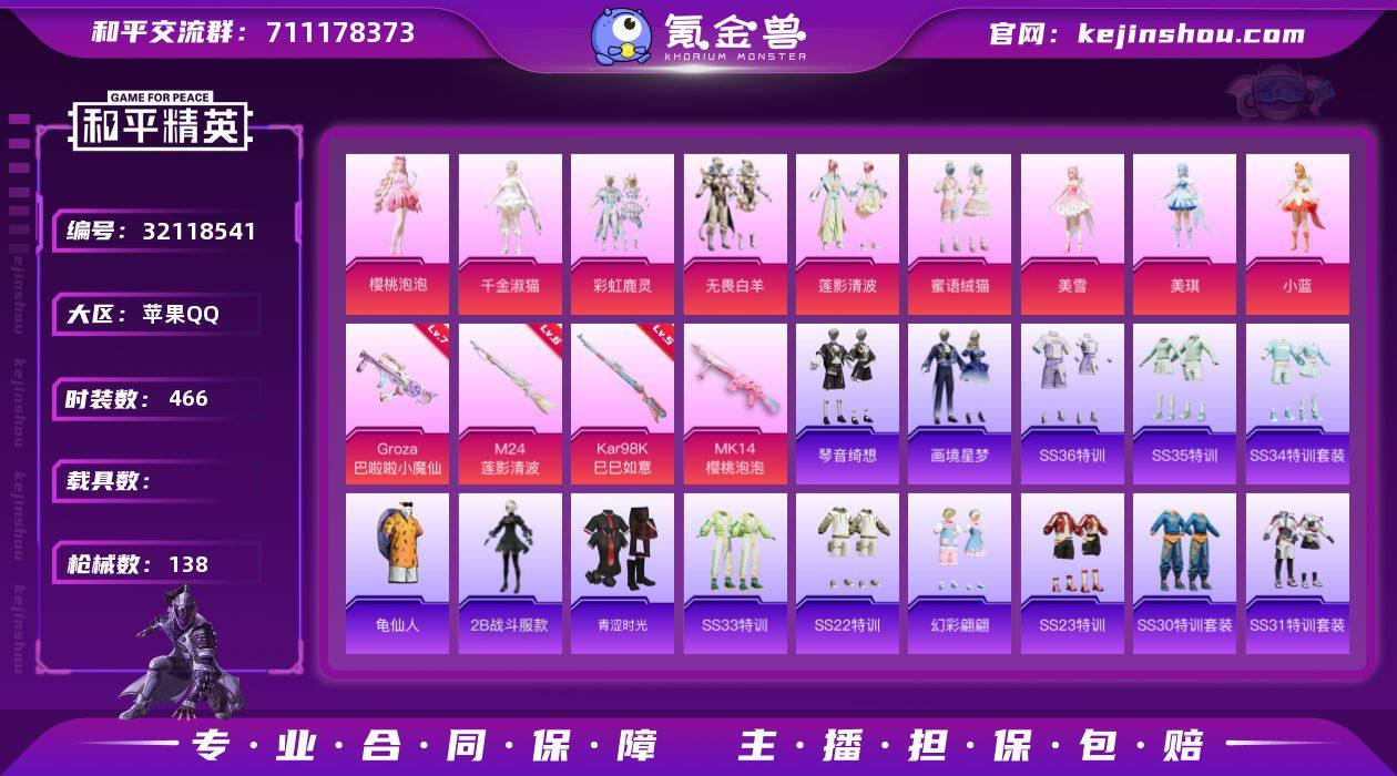 安卓 手Q-5粉装-7特效枪-0载具-0粉色飞行器-41860热力值-8王牌印记-103套装-139枪皮 【热门品类】:角色-军刀雅典娜,套装-龟仙人,套装-红红火火 【粉色套装】:粉装-宝贝奶油派,粉装-天使彩虹糖,粉装-新星烈龙,粉装-垂柳戏鸭,角色-樱桃泡泡 【粉色枪皮等级】:AKM-星际浪客(六级),M416-五爪金龙(七级),AKS-74U-森灵之息(三级),Kar98K-巳巳如意(三级),M249-彩虹甜喵(五级),DP-28-豹影疾电(五级) 【粉色枪皮】:AKM-星际浪客,M416-五爪金龙,AKS-74U-森灵之息,Kar98K-巳巳如意,Mk14-福马献瑞,M249-彩虹甜喵,DP-28-豹影疾电 【粉色降落伞】:幻影战神降落伞,百万伏特降落伞,甜心宝贝降落伞,神秘黑猫降落伞,垂柳戏鸭降落伞,太空嘟嘟降落伞,暗夜鎏金降落伞,第五大道降落伞,炫彩糖果降落伞 【稀有套装】:套装-龟仙人,套装-马上来财,套装-燕燕于飞,套装-鱼渊荷华,套装-紫幽梦,套装-蓝冰羽,角色-猎影月神,套装-星渊小夜曲,套装-雨过天青,套装-红釉青花 【稀有枪皮】:AKM-2P战斗服款,AKM-环太平洋,AKM-百万伏特,AKM-缤纷海域,AKM-龙的传人,M16A4-幻世战舞者,M16A4-甜心亚梦,SCAR-L-炫彩节奏,SCAR-L-玉兔迎春,SCAR-L-红色方程式,M416-月影鸳鸯,M416-糯团青竹,M416-红色方程式,GROZA-田园牧歌,AUG-天降萌叽,AUG-幻影战神,AUG-甜蜜菠萝,AUG-耀粉歌者,QBZ-彩虹符号,M762-天降萌叽,M762-萌物绒绒,Mk47-妙红点点,AC-VAL-天降萌叽,AC-VAL-甜心亚梦,蜜獾-垂柳戏鸭,蜜獾-天降萌叽,蜜獾-娇憨猪猪,UZI-啾咪啾咪,UZI-天降萌叽,UZI-娇憨猪猪,UZI-幻影战神,UMP45-生命誓言,Vector-田园牧歌,汤姆逊-天降萌叽,P90-倾城蜜语,Kar98K-彩虹符号,M24-冰封烈焰,AWM-垂柳戏鸭,SKS-炫彩节奏,VSS-星之彼岸,VSS-田园牧歌,Mini14-耀粉歌者,SLR-娇憨猪猪,AMR-妙红点点,...