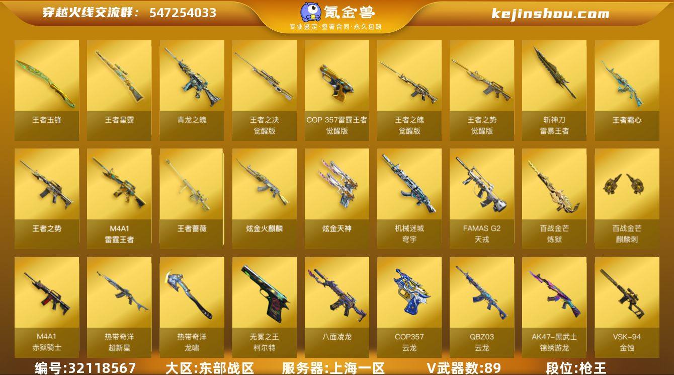 上海一区-101V-21王者武器数-2炫金武器数 【传说角色】:传说影煞 【热门武器】:QBZ03-金色蔷薇,Scar Light-白虎,M200-幻神*2,八面凌龙,死亡之眼,青龙之魄,荣耀世冠-火麒麟,荣耀世冠-柯尔特,Kar98K-星神,M4A1-黑骑士*2,汤姆逊-烈龙*5,斯泰尔-蝴蝶,MK5-炽火炎龙,沙鹰-修罗,炽芒蝶刃*3,荣耀世冠-龙啸 【王者炫金武器】:王者之势*2,M4A1-雷霆王者,王者霜心,青龙之魄,王者蔷薇,王者星霆,王者玉锋,斩神刀-雷暴王者,炫金火麒麟,炫金天神 【音效卡】:M200-幻神音效卡,M4A1-雷神音效卡*2,M4A1-黑骑士音效卡,Barrett-毁灭音效卡,QBZ03-金色蔷薇音效卡,QBZ03-天罚音效卡,Barrett-碧霄极光音效卡,炼狱-百战金芒-庆典舞曲音效卡 【皮肤】:幻神-CFS2022,幻神-星耀 皮肤,白虎-霓虹机甲 皮肤*2,白虎-巅峰荣耀 皮肤,金色蔷薇-量子蔷薇 皮肤,QBZ03-CFS2024 皮肤,裁决-叶芒苍灵 皮肤,星神-AG-CFPLS21冠军皮肤,雷神-荣耀之魄,雷神-耀金皮肤,雷神-CFS十周年纪念版 皮肤,雷神-维纳斯皮肤,M4A1-再燃火线,雷神-神秘按键 皮肤,雷神-宋雨琦 皮肤,火麒麟-华夏之心,毁灭-星空,毁灭-CFS2020,毁灭-星耀 皮肤,毁灭-百城浙江 皮肤,毁灭-英雄计划 皮肤,黑骑士-CFS2021,极光-高能霹雳 皮肤,炼狱-星空,修罗耀金皮肤*2,轻型军用手斧-再燃火线,麒麟刺-甜蜜糖果 皮肤,炽芒蝶刃-宋雨琦 皮肤 【角色】:晴雅,隼,星际战将,研,华,零·纪元,雪域霜狐,奇洋探员,乔伊教练,修道士,葵-阿尔法武装,暗夜-X,初恋灵狐,飞虎队-X,风暴女,0号玩家,零-水下丽影,曼陀罗-X,萌儿,潘多拉-X,甜心偶像,蜀雪,铁骑荣耀,兔囡囡,铁扇公主-暗灵,维纳斯,雪莉杨,夜玫瑰-宠粉,影武者-X,游珑儿,智影 【人偶武器】:M4A1-雷神-精英刀锋,MK5-炽火炎龙,斯泰尔-蝴蝶,加特林-机械猎手,AWM-灵...