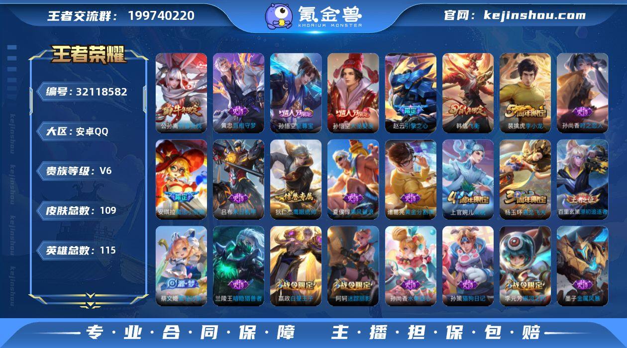 安卓Q 可二次 1传说115英雄109皮肤 祈雪灵祝 至尊宝 祈雪灵祝 飞衡 大圣娶亲 魔法小厨娘 引擎之心 猎兽之王 星空之诺 银河之约 原初追逐者 美猴王 梁祝 黄忠百相守梦 原初探秘者 李小龙 暗隐猎兽者 猫狗日记男 金属风暴 白昼王子 黄金分割率 圣诞恋歌 乘风破浪 末日机甲男 时之恋人女 街头霸王 迷踪丽影 繁星吟游 遇见飞天 乱世虎臣 鹰眼统帅 魔术师 王者荣耀账号