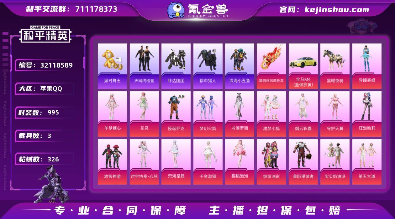 实名:不可二次实名 是否支持人脸包赔:不支持 粉装数量:26 特效枪数量:23 载具数:3 时装数:995 枪械数:326 都市猎人,胖达团团,派对舞王,深海小丑鱼,天网终结者 异瞳寒姬,羊梦糖心,花灵,宝贝奶油派,缤纷油彩,第五大道,蝶舞迷情,放客神游,怪诞乔克,奇迹舞步-美琪,狂魅哈莉,冷漠罗丽,梦幻火箭,蜜语绒猫,千金淑猫,奇迹舞步-美雪,守护天翼,时空协奏·心弦,天使彩虹糖,甜梦小狐,星际漫游者,星空之魅,荧海星豚,樱桃泡泡,烟云彩露,智能音符 七级AKS-74U-星穹咏叹调,七级破片手榴弹-瓶中星球,七级SPAS-12-蜜语绒猫,六级Vector-绯穹魔姬,五级AA12-G-萌骑幻想,五级MK14-福马献瑞,五级AKS-74U-森灵之息,五级蜜獾-异瞳寒姬,五级DP-28-豹影疾电,五级MG-36-沧焰双生,五级AKM-绿萝繁花,五级GROZA-镜光银凌,五级JS9-奇迹舞步,五级Kar98K-巳巳如意,五级M416-电玩时刻,五级SCAR-L-锦绣绵绵,五级汤姆逊-热量炸弹,五级UMP45-量子极限,五级烟雾弹-猫咪绅士,三级P90-魔童闹海 敖丙,三级M416-灵猫魔法师,三级P90-沙丘之主,三级Vector-最终圣卫者 踏焰逐风摩托车,宝马M4(圣保罗黄),黑曜夜骑 狙击之神,罗莉,马上来财,福马献瑞,红釉青花,SS37特训,雨过天青,青翼流星,馥郁金蕊,雪国风尚,画境星梦,琴音绮想,书海巡游,SS36特训,芝士鼠鼠,炫彩糖果,风蚀行者,绯色魅影,萌鸡速递,紫俏灵猫,风迹短诗,秘语星愿,SS35特训,午间小调,TT猎星队服,玄霖雨神,元气之梦,漫游都市,绯夜呢喃,美羊羊,喜羊羊,薄荷星砂,狂鲨锋刃,凌霄紫焰,擎苍青焰,SS34特训套装,夜幕侵蚀,游乐,朱霞炽焰,Alan Walker,暗夜风云,暗影哥特,冰冻风暴,缤纷果语,白光莹,滨海厨神,冰河战士,白色伏地魔,白熊同盟,纯白跃动,春光漫游,彩虹兔,雏菊兔兔,长空猛禽,潮流炫酷,潮萌小黄鸭,超能勇士,春日漫步,创世·幻影,晨曦薄雾,纯真浪花,顶瓜瓜,蝶变,大橘大利,呆萌铁蟹,都市猎人,都市魅力,都市漫游者,蝶吟花词,淡雅花蕊,绯格组合,粉恋花,粉日山川,诡诞巡游,龟仙人,光之冒险,幻彩翩翩,混沌火种,海岛探路者,湖蓝色名流,海琴烟,怀庆长公主,黑色伏地魔,黄色伏地魔,黄色名流,黄色运动,红色运动,幻世战舞者,红熊茄茄,荒原牛仔,幻羽潜行,幻影武者,花园小羊咩,鲛海歌灵,晶辉守护,酒红色名流,惊鸿侠骨,橘黑制服,娇憨猪猪,竞技达人朋克,竞技名士,晶灵使者,极速红龙,街头潮人,街头风暴,焦糖可颂,锦衣飞扬,绛羽幽主,空岛之星,狂花道·娜可露露,快闪甜心,临安公主,蓝冰羽,蓝彩潮人,龙的传人,蓝海鲸歌,龙魂突击队,猎鹰,冷酷挑战者,玲珑飞花,萝兰蝴蝶,灵蜜圈圈,浪漫天命,蓝色运动,蓝调潮影,恋语绒绒,冷焰舞者,猎影月神,Mark.06,漫步者,猛禽,妙红点点,棉花软糖,萌黄之夏,魅力单车,麻辣教官,懵萌河马,曼妙人鱼,萌趣咩咩,萌趣绒叽,墨青刃影,萌神柯基,梦域神使,卖崽青蛙,弄潮海豚,霓虹街区,怒火燎原,霓虹热舞,柠萌假日,牛气冲天,牛气满满,牛仔情诗,胖达团团,派对舞王,破蛋小黄鸡,破晓战魂,青春校园,轻风白浪,绮丽涂鸦,青年教官,俏皮奶喵,青涩年华,青涩时光,青团波波,俏兔智灵,云朵鹅,绒宝小鹅,糯粉咩咩,荣耀,热情海星,人气偶像,软软马卡龙,热血青春,软羊咩咩,深海小丑鱼,深蓝色名流,神气柴柴,SS19特训,SS20特训,SS21特训,SS22特训,SS23特训,SS24特训