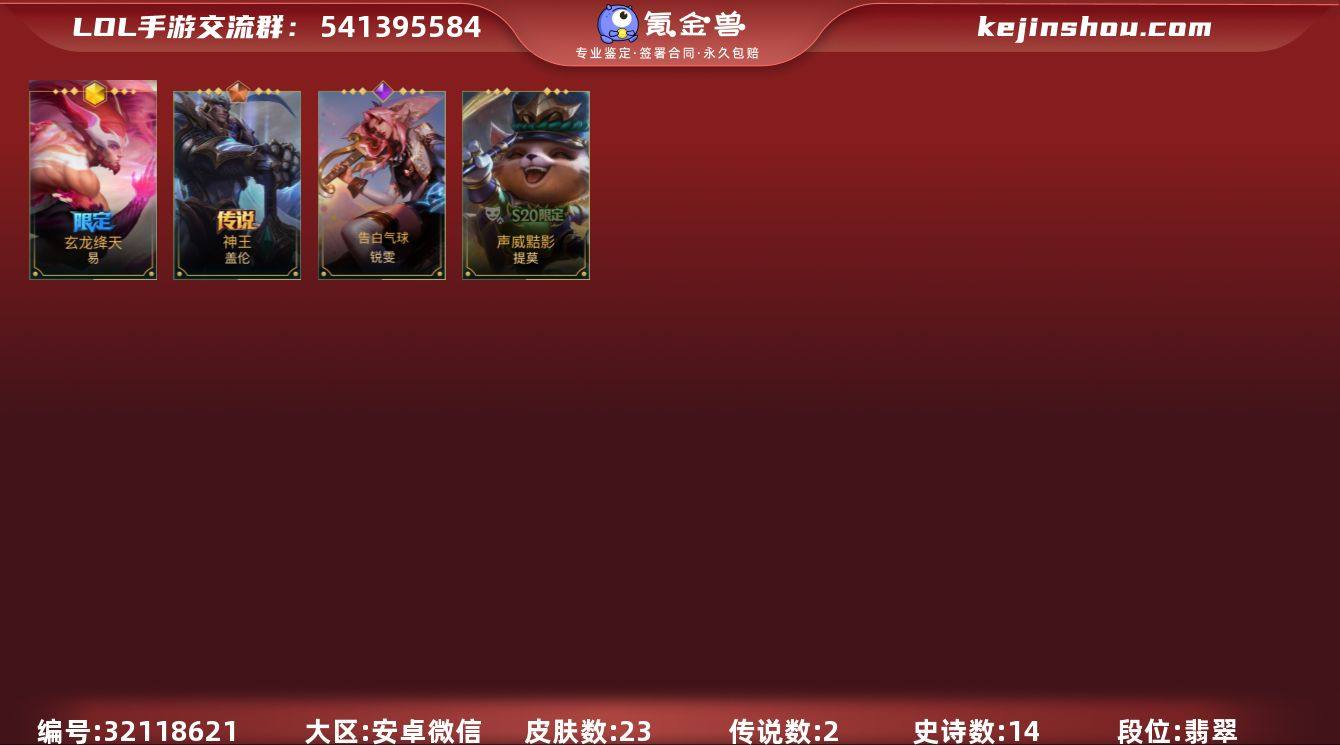 实名:不可二次实名 段位:翡翠 英雄数:20 皮肤数:23 神话皮肤数量:1 传说皮肤数量:2 终极数:0 典藏皮肤数量:0 玄龙绛天 易 神王盖伦 告白气球 锐雯 声威黠影 提莫 卖家说:暂时不可二次实名,账号安全。有改名卡