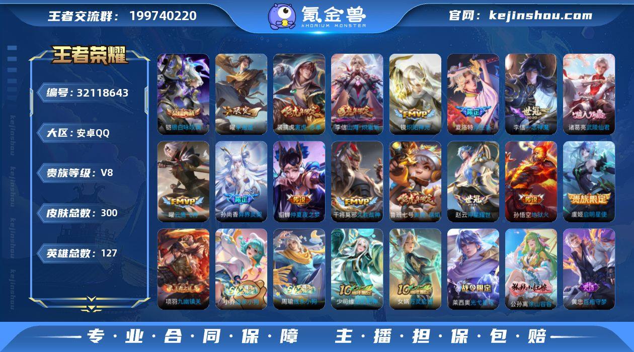 不可二次 安卓Q-V8-最强王者段位-127英雄-300皮肤-1典藏皮肤-15传说-94史诗 QW263613 【英雄全皮】:夏洛特全皮,影全皮 【荣耀典藏】:铠银白咏叹调 【传说皮肤】:夏洛特浮生妄,李信山海炽霜斩,裴擒虎寅虎赤拳,鲁班七号寅虎瑞焰,孙尚香异界灵契,赵云淬星耀世,曜李逍遥 ,镜炽阳神光,虞姬启明星使,曜云鹰飞将,李信一念神魔,干将莫邪久胜战神,诸葛亮武陵仙君,貂蝉仲夏夜之梦,孙悟空地狱火 【限定皮肤】:狄仁杰阴阳师,廉颇寅虎御盾,赵云皇家上将,墨子神迹守卫,孙尚香异界灵契,鲁班七号寅虎瑞焰,庄周高山流水,高渐离死亡摇滚,高渐离玩趣恶龙,钟无艳王者之锤,钟无艳超时空战士,孙膑寅虎展翼,芈月幻夜卜梦,周瑜真爱至上,元歌云间偶戏,元歌无心,甄姬落雪兰心,典韦岱宗,马可波罗山海玄木吟,狄仁杰魔术师,狄仁杰万华元夜,达摩星际陆战队,达摩沙漠行僧,项羽海滩派对,老夫子醍醐杖,老夫子航海奇遇记,程咬金演武夺筹,露娜一生所爱,韩信逐梦之影,韩信飞衡,韩信傲雪梅枪,兰陵王金庭之子,花木兰青春决赛季,亚瑟潮玩骑士王,孙悟空至尊宝,孙悟空大圣娶亲,孙悟空孙行者,牛魔御旌,后羿如梦令,后羿圣弓游侠,李元芳云中旅人,虞姬霸王别姬,虞姬启明星使,钟馗驱傩正仪,杨玉环寅虎心曲,干将莫邪真爱魔法,雅典娜黎明之约,鬼谷子原初探秘者,鬼谷子五谷丰年,诸葛亮武陵仙君,大乔白鹤梁神女,黄忠火炮绅士,苏烈千军破阵,百里玄策原初追逐者,百里守约朱雀志,弈星混沌棋,梦奇顽趣,公孙离蜜橘之夏,沈梦溪大漠名商,裴擒虎李小龙,裴擒虎寅虎赤拳,裴擒虎擒涛扼浪,米莱狄御霄,米莱狄胡桃异想国,云中君纤云弄巧,李信山海炽霜斩,伽罗天狼溯光者,盾山御銮,上官婉儿梁祝,嫦娥拒霜思,嫦娥暖冬兔眠,曜李逍遥 ,西施玲珑珍味,鲁班大师探海日志,镜匿光追影者,桑启...