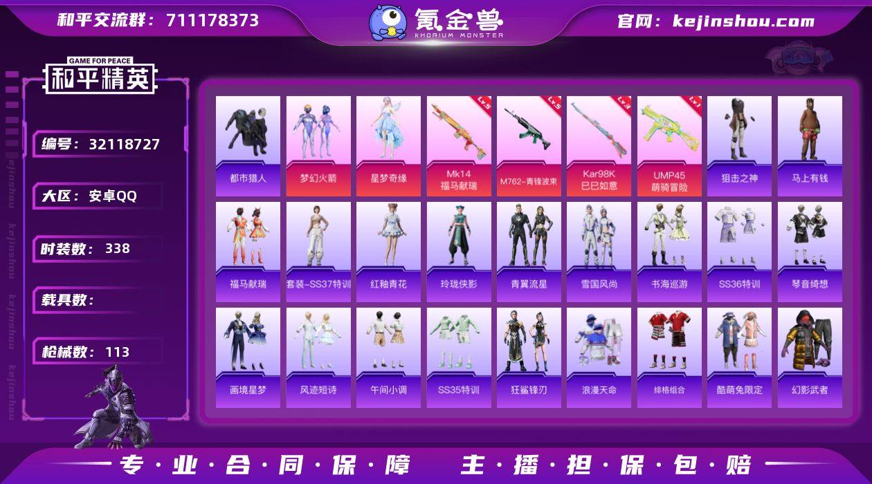 实名:可二次实名 是否支持人脸包赔:不支持 粉装数量:2 特效枪数量:4 时装数:338 枪械数:113 都市猎人 梦幻火箭,星梦奇缘 五级MK14-福马献瑞,五级M762-青锋波束,三级Kar98K-巳巳如意,一级UMP45-萌骑冒险 狙击之神,马上有钱,福马献瑞,红釉青花,SS37特训,雨过天青,玲珑侠影,青翼流星,雪国风尚,画境星梦,琴音绮想,书海巡游,SS36特训,风迹短诗,SS35特训,午间小调,狂鲨锋刃,暗影哥特,冰冻风暴,缤纷果语,北国孤狼,白色伏地魔,雏菊兔兔,长空猛禽,潮流炫酷,传奇侦探,呆萌铁蟹,都市猎人,飞驰魅影,绯格组合,疯狂小兔子,海岛探路者,黄色伏地魔,黄色名流,黄色运动,幻世战舞者,幻影武者,极冰使者,竞技名士,竞技勇士朋克,极速红龙,街头潮人,街头风暴,酷萌兔限定,萝兰蝴蝶,黎明保卫者,浪漫天命,蓝色运动,冷焰舞者,漫步者,魅力单车,柠萌假日,牛气满满,破蛋小黄鸡,绮丽涂鸦,青团波波,青玉碎影,SS19特训,SS29特训,SS30特训套装,SS33特训套装,糖糖葫芦,听雨铃兰,炫蓝之夏,先驱飞行员,香桃花海,星途旅人,跃动心情,音速流光,鹰眼刺客,战地领军 橘柚倾心降落伞,魔法神域降落伞,拳皇·狂花道降落伞,忍者神龟降落伞,星梦奇缘降落伞 卖家说:还有最后10发就出金鞋子特权卡还有很多天连体王者V6王者有一个典藏三个传说,还有很多至尊宝限定皮肤。非常的有性价比。地铁满天赋,很多装备