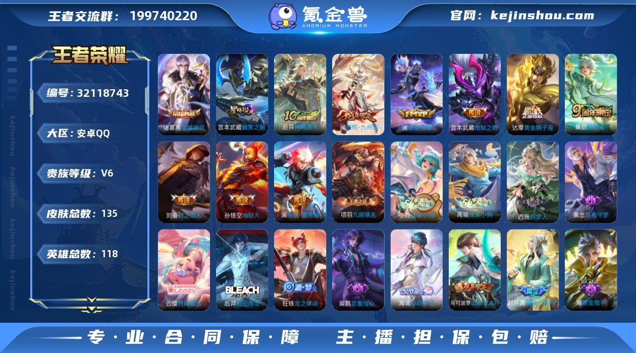 安卓Q-135皮肤-1典藏皮肤-9传说-39史诗 【英雄全皮】:孙权全皮,澜全皮,空空儿全皮,影全皮 【荣耀典藏】:诸葛亮星域神启 【传说皮肤】:后羿神树通天,澜愿照九州拓,桑启鸣野蒿,澜逐花归海,澜电玩雷克斯,刘备时之恋人,达摩黄金狮子座,宫本武藏地狱之眼,孙悟空地狱火 【限定皮肤】:蒙犽顽岩魄,大乔绒语心约,姜子牙天穹之誓,狄仁杰阴阳师,赵云皇家上将,马可波罗山海玄木吟,狄仁杰魔术师,项羽海滩派对,干将莫邪胡桃夹子,梦奇顽趣,裴擒虎擒涛扼浪,西施玲珑珍味,鲁班大师探海日志,戈娅驭风魔法,阿古朵江河有灵,张良古海寻踪,鬼谷子天穹祈灯,沈梦溪龙舞盛年,刘邦剑破天穹,程咬金群星魔术团,海诺心动手记,周瑜熔金海岸 【年限皮肤】:马可波罗山海玄木吟,澜愿照九州拓 【赛季限定】:裴擒虎擒涛扼浪,鲁班大师探海日志,张良古海寻踪,鬼谷子天穹祈灯,刘邦剑破天穹,姜子牙天穹之誓,东皇太一噬灭天穹,太乙真人谧流熔炉,钟馗虚灵犬护,甄姬逆浪荇歌,亚瑟荣光之誓,梦奇顽趣,牛魔星界战将,项羽九幽镇关 【战令限定】:戈娅驭风魔法,西施玲珑珍味,周瑜线条小狗,小乔线条小狗 【史诗皮肤】:周瑜线条小狗,小乔线条小狗,项羽九幽镇关,西施织梦人,黄忠百相守梦,云缨赞萌露比,后羿石田雨龙,扁鹊灵蛊蚀心,狂铁龙之律动,赵怀真器灵浮梦炉,牛魔星界战将,蒙犽顽岩魄,海诺心动手记,阿古朵江河有灵,戈娅驭风魔法,马可波罗山海玄木吟,梦奇顽趣,澜赏金猎手,司马懿暗渊魔法,钟馗乐园奇幻夜,蒙犽龙鼓争鸣,狄仁杰鹰眼统帅,白起星夜王子,李元芳逐浪之夏,铠曙光守护者,雅典娜冰冠公主,亚瑟心灵战警,兰陵王暗隐猎兽者,花木兰水晶猎龙者,韩信白龙吟,吕布末日机甲,墨子金属风暴,妲己魅力维加斯,嬴政摇滚巨星,孙尚香水果甜心,宫本武藏鬼剑武藏,廉颇地狱岩魂,狄...