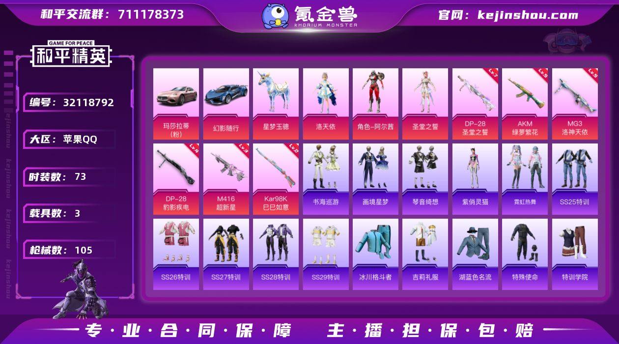 【AZH2994】苹果 手Q【洛天依 超新星M416 满级圣堂之誓DP-28 3载具】6粉装-9特效枪-3载具-4粉色飞行器-38815热力值-5王牌印记-73套装-105枪皮 【粉色套装】:角色-洛天依,角色-阿尔茜,角色-圣堂之誓,角色-绛云霓裳,角色-辉光之愿,角色-烬夜之誓 【粉色枪皮等级】:AKM-绿萝繁花(五级),M416-超新星(三级),AKS-74U-森灵之息(五级),Kar98K-巳巳如意(二级),Mk14-福马献瑞(三级),DP-28-圣堂之誓(七级),DP-28-豹影疾电(四级),MG3-洛神天依(五级),PKM-萌骑夺宝(一级) 【粉色载具】:玛莎拉蒂Ghibli(粉),幻影随行,星梦玉骢 【粉色枪皮】:AKM-绿萝繁花,M416-超新星,AKS-74U-森灵之息,Kar98K-巳巳如意,Mk14-福马献瑞,DP-28-圣堂之誓,DP-28-豹影疾电,MG3-洛神天依,PKM-萌骑夺宝 【粉色飞行器】:香车宝马飞行器,绛云霓裳飞行器,谜鸦审判飞行器,辉光之愿飞行器 【粉色降落伞】:洛神天依降落伞,天星战神降落伞,圣堂之誓降落伞,猪猪侠降落伞,星梦奇缘降落伞,宁雨蝶降落伞,异瞳寒姬降落伞,炫彩糖果降落伞,绛云霓裳降落伞,辉光之愿降落伞 【稀有套装】:套装-雪国风尚,套装-小财神当家,套装-马上来财,套装-霓虹热舞,角色-紫俏灵猫,套装-书海巡游,套装-画境星梦,套装-琴音绮想,套装-月光旧梦,角色-鎏光妙舞,角色-云韶流音,套装-雨过天青,套装-红釉青花,角色-缚爪幽影,角色-曹焱兵 【稀有枪皮】:AKM-龙的传人,M16A4-绒绒猫尾,SCAR-L-炫彩节奏,M416-糯团青竹,M416-蓝色火焰,AUG-天降萌叽,QBZ-彩虹符号,QBZ-未来歌姬,QBZ-洛神天依,Mk47-洛神天依,AC-VAL-快闪甜心,ACE32-画境星梦,UMP45-生命誓言,Vector-焰鹰斗篷,Vector-夜灯,Vector-生命誓言,汤姆逊-天降萌叽,汤姆逊-绒绒猫尾,汤姆逊-像素花束,野牛-天星战神,MP5K-画境星梦,P90-快闪甜心,Kar98K-洛神天...