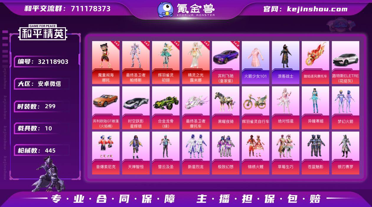 【老101】【新红装】【特价出 永久包售后!!!】安卓 微信-6神装-27粉装-30特效枪-10载具-20粉色飞行器-188335热力值-16王牌印记-299套装-445枪皮 【红色载具】:宾利飞驰(皇家紫)(三级) 【红色神装等级】:灵驹仙姬-云歌(五级),暮色玫影-艾丽娅(一级),魔童闹海-哪吒(一级),最终圣卫者-帕修斯(一级),辉羽雀灵-初翊(一级),精灵之光-露米娜(一级) 【红色角色神装】:灵驹仙姬-云歌,暮色玫影-艾丽娅,魔童闹海-哪吒,最终圣卫者-帕修斯,辉羽雀灵-初翊,精灵之光-露米娜 【热门品类】:粉装-梦幻火箭,粉装-音爆索尼克,绝对防御上衣,套装-火箭少女101,角色-军刀雅典娜,套装-浪客战士,套装-龟仙人,套装-暗影哥特,套装-粉红小猪 【粉色套装】:角色-绝对恒星,粉装-梦幻火箭,粉装-天禅智恒,粉装-彗云及圣,粉装-新星烈龙,粉装-极致幻想,粉装-锦绣火鲤,粉装-草莓生巧,粉装-苍蓝魅影,粉装-银刃赛罗,粉装-冰霜白皇,粉装-暗夜玫瑰,角色-洛天依,粉装-吟月归客,粉装-筑梦精灵,粉装-音爆索尼克,角色-白勺歌姬,角色-呆萌星弥,粉装-莲影清波,角色-狂花道·不知火舞,角色-千金淑猫,角色-樱桃泡泡,角色-冷漠罗丽,角色-异瞳寒姬 【粉色枪皮等级】:AKM-梦之光华(七级),AKM-暮色玫影(三级),SCAR-L-青春物语(六级),SCAR-L-魔童闹海 哪吒(三级),M416-心之恋语(六级),M416-灵猫魔法师(三级),GROZA-精灵之光(一级),AUG-许七安(七级),M762-激战未来(七级),蜜獾-异瞳寒姬(三级),ACE32-绿头鱼(一级),UMP45-萌骑冒险(一级),Vector-最终圣卫者(三级),AKS-74U-森灵之息(五级),P90-沙丘之主(一级),Kar98K-伏魔团(四级),Kar98K-巳巳如意(五级),Mk14-樱桃泡泡(一级),Mk14-甜梦熊击(五级),Mk14-福马献瑞(四级),M200-梦海之灵(一级),M249-彩虹甜喵(七级),M249-绝对恒星(一级),DP-28-豹...