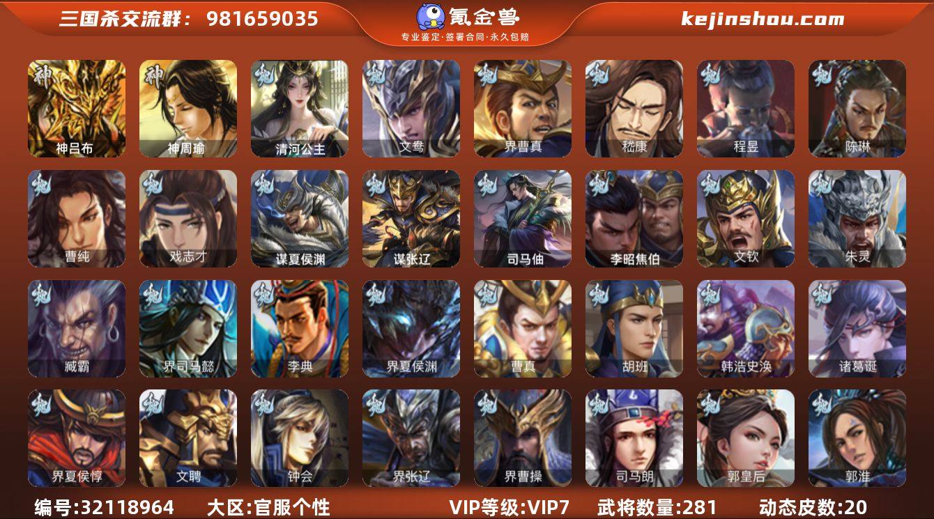 官阶: 骠骑将军 VIP等级: VIP7 武将数量: 281 动态皮肤数量: 20 神将: 神吕布,神周瑜 魏国武将: 戏志才,曹纯,陈琳,程昱,嵇康,界曹真,文鸯,张辽,SP蔡文姬,SP关羽,SP贾诩,SP姜维,SP庞德,卞夫人,蔡贞姬,曹昂,曹操,曹冲,曹洪,曹丕,曹仁,曹叡,王异,张恭,界满宠,曹休,界曹植,满宠,荀攸,钟繇,郭嘉,牵招,荀彧,阮慧,界郭嘉,崔琰,界曹丕,界荀彧,朱灵,界甄姬,吕虔,界王异,界郭淮,陈群,界邓艾,界曹休,袁涣,李通,乐进,辛宪英,郭淮,郭皇后,夏侯惇,曹植,司马朗,界曹操,许褚,界张辽,张郃,钟会,文聘,曹彰,界夏侯惇,诸葛诞,司马懿,甄姬,徐晃,韩浩史涣,胡班,曹真,典韦,界夏侯渊,夏侯渊,李典,于禁,邓艾,界司马懿,臧霸,朱灵(国战),文钦-魏,李昭焦伯,清河公主,司马伷,谋张辽,谋夏侯渊 蜀国武将: 谋赵云,徐庶,杨仪,吕凯,界关羽,邓芝,界伊籍,费祎,严颜,界黄月英,赵云,张松,彭羕,李丰,界刘备,刘封,谋庞统,黄月英,关羽,吴懿,张飞,黄皓,魏延,界周仓,马忠,界法正,糜夫人,刘禅,界赵云,界姜维,关银屏,SP孙尚香,SP徐庶,卧龙诸葛,周仓,简雍,界关兴张苞,诸葛亮,法正,界简雍,陈到,界马岱,关平,马岱,界庞统,庞统,诸葛果,马谡,马超,廖化,关兴张苞,孟获,夏侯氏,姜维,黄忠,刘备,界马超,马良,傅肜,蒋琬费祎,刘谌,彭羕(国战),甘夫人,蜀-糜芳傅士仁,SP甘夫人 吴国武将: 界朱然,文鸯,周泰,吕蒙,诸葛恪,界顾雍,大乔小乔,桥公,谋周瑜,界程普,丁奉,谋吕蒙,周鲂,顾雍,界朱治,孙休,界孙权,祖茂,濮阳兴,孙登,凌操,孙尚香,程普,大乔,韩当,陆逊,诸葛瑾,朱然,吕范,太史慈,周妃,虞翻,界黄盖,孙鲁班,界周瑜,界潘璋马忠,卫温诸葛直,孙权,谋小乔,界小乔,界甘宁,界韩当,吴国太,甘宁,界大乔,孙坚,孙鲁育,凌统,步练师,周瑜,小乔,潘璋马忠,黄盖,孙策,界陆逊,界吴国太,吴-文钦,谋韩当,徐盛,张昭张纮,陈武蕫袭,吴-糜芳傅士仁,朱桓 群国武将: 界李儒,界左慈,沮授,麹义,兀突骨,伏完...
