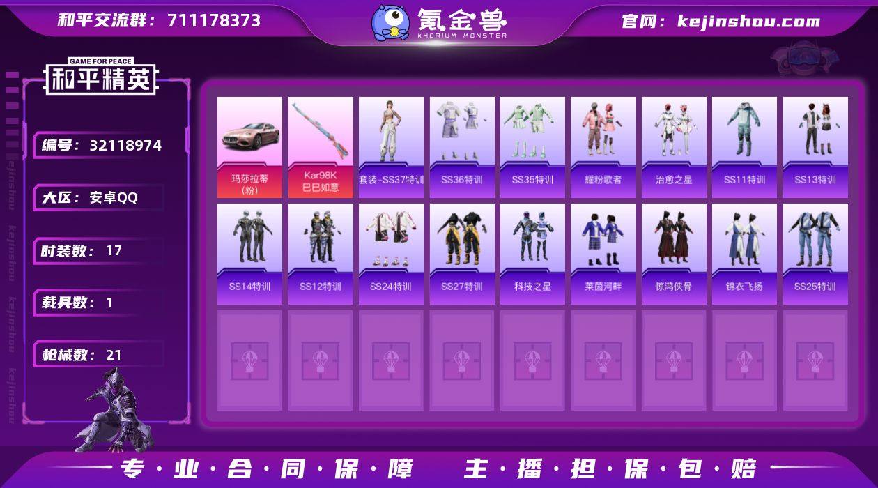 【和平精英】0粉装,3特效枪,1载具,历史最高段位:卓越王牌5星 王牌印记3次 热力值:22858,62套装,86枪械,84装备,54战备;套装:套装-猎鹰,套装-黄色运动,套装-骑行爱好者,套装-竞技名士,套装-长空猛禽,套装-蓝色守护者,套装-海岛探路者,套装-战地菁英,套装-黄色格斗者,套装-甜蜜告白,套装-街头潮人,套装-酷萌兔限定,套装-怒火燎原,套装-魅力单车,套装-耀眼新星,套装-夜莺强袭者,套装-破晓战魂,套装-热血青春,套装-SS2特训,套装-雪山精英,套装-青涩时光,套装-SS3特训,套装-破蛋小黄鸡,套装-疯狂小兔子,套装-SS5特训,套装-鹤鸣,套装-萌黄之夏,套装-牛气满满,套装-SS11特训,套装-战术大师,套装-狙击之神,套装-SS12特训,套装-耀粉歌者,套装-治愈之星,套装-科技之星,套装-SS13特训,套装-SS14特训,套装-绯格组合,套装-莱茵河畔,套装-青玉碎影,套装-SS24特训,套装-SS25特训,套装-惊鸿侠骨,套装-锦衣飞扬,套装-龙的传人,套装-云魄琉璃,套装-SS27特训,套装-SS31特训,套装-SS33特训,套装-巳巳如意,套装-青翼流星,套装-炫彩糖果,套装-元气之梦,套装-SS34特训,套装-薄荷星砂,套装-SS35特训,套装-SS37特训,套装-SS36特训,套装-雪国风尚,套装-萌鸡速递,套装-福马献瑞,套装-马上来财;枪皮:M762-牛气冲天,M416-蓝色火焰,M416-绯红前夜,M416-红色方程式,M416-乌木金纹,AKM-破晓战魂,AKM-夜灯,AKM-涂鸦街区,AKM-虎虎生威,AKM-龙的传人,AKM-霓彩脉冲,Famas-霓彩脉冲,Famas-乌木金纹,GROZA-生命誓言,GROZA-治愈之星,GROZA-紫矿核心,GROZA-福马献瑞,ACE32-冰晶雪宝,AC-VAL-乌木金纹,AC-VAL-天降萌叽,AC-VAL-荒原烈焰,AUG-耀粉歌者,AUG-乌木金纹,QBZ-赛罗,SCAR-L-生命誓言,SCAR-L-乌木金纹,蜜獾-启元战纹,M16A4-夜灯,M16A4-千金淑猫,...