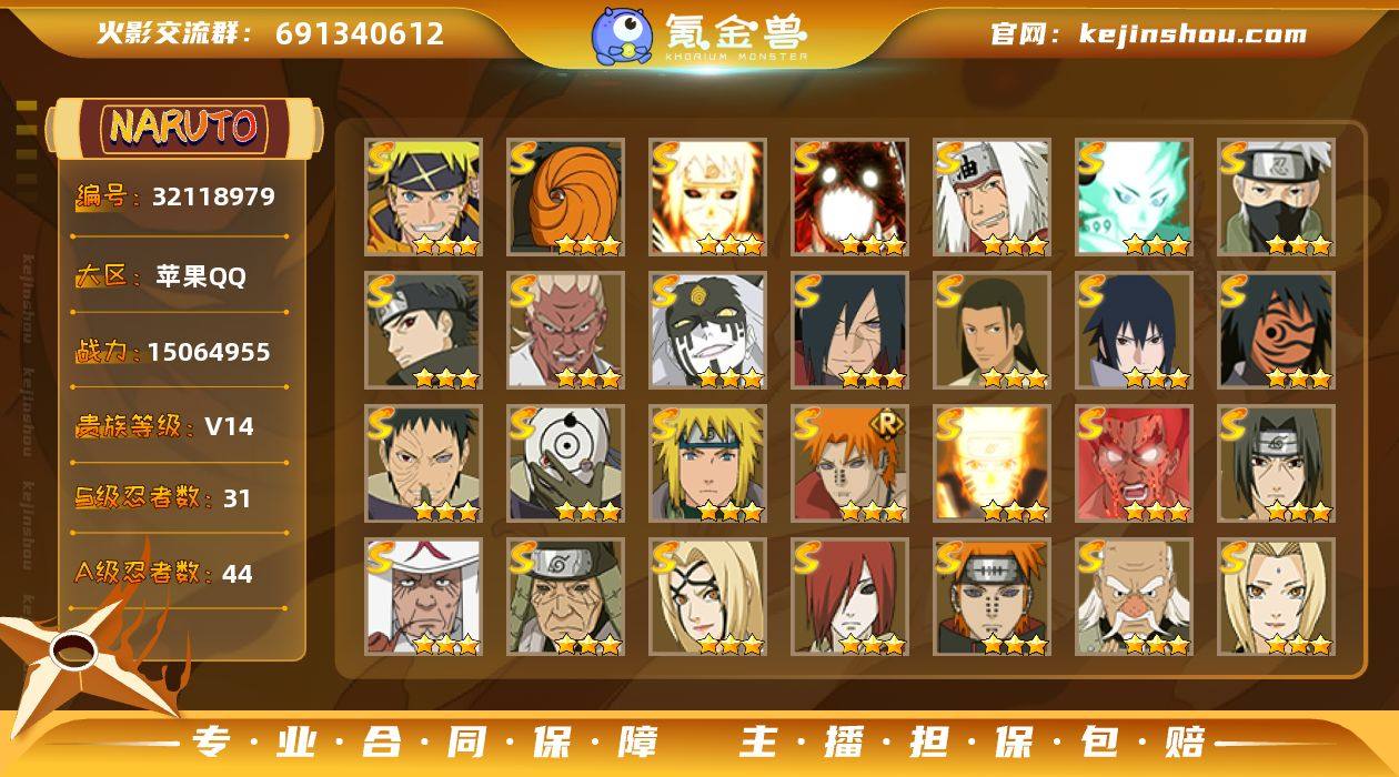 实名:不可二次实名 贵族等级:V14 战力值:15064955 S忍数:31 A忍数:44 三星漩涡鸣人·宇智波佐助,三星宇智波斑「五影会谈」,三星波风水门「九喇嘛连结」,三星漩涡鸣人「暴怒·第六尾」,三星自来也「传说中的三忍」,三星大筒木舍人「最终章」,三星旗木卡卡西「须佐能乎」,三星宇智波止水「须佐能乎」,三星艾「忍界大战」,三星大筒木桃式,三星宇智波斑「秽土转生·解」,三星千手柱间·木叶创立,三星宇智波佐助「永恒万花筒」,三星神秘面具男「红夜之刃」,三星宇智波带土「忍界大战」,三星宇智波斑「白面具」,三星波风水门,三星佩恩·天道「超」,三星漩涡鸣人「九喇嘛连结」,三星迈特凯「死门」,三星宇智波鼬「须佐能乎」,三星猿飞日斩,三星猿飞日斩「秽土转生」,三星纲手「百豪」,三星长门「秽土转生」,三星佩恩「天道」,三星大野木「忍界大战」,三星纲手,三星春野樱「忍界大战」,三星大筒木金式「博人传」,三星自来也「舞之豪杰」 五星干柿鬼鲛,五星猿飞阿斯玛,五星迈特凯,三星飞段「死司凭血」,三星飞段,三星我爱罗「疾风传」,三星蝎,三星旗木卡卡西,二星旗木卡卡西「神威对决」,二星小南「神驹佑将」,二星迈特凯「青春爆炸」,二星纲手「妖怪奇谭」,二星巳月「仙人模式」,二星大野木「侠隐江湖」,二星机械鸣人「初始形态」,二星土台「忍界大战」,二星桃地再不斩「秽土转生」,二星神农「羁绊」,二星宇智波带土「漂泊浪客」,二星宇智波泉奈,二星蝎「绯流琥」,二星角都「秽土转生」,二星李洛克「忍界大战」,二星旗木卡卡西「幻之真容」,二星日向雏田「最终章」,二星漩涡博人「桃式显现」,二星小南「漂泊浪客」,二星日向宁次·忍界大战,二星长十郎「六代目水影」,二星纲手「侠隐江湖」,二星长门「青年」,二星艾「青年」,二星照美冥「侠隐江湖」,二星不风,二星波风水门「青年」,二星宇智波止水「新春限定」,二星黑土「博人传」,二星宇智波佐助「须佐能乎」,二星千代「近松十人卫」,二星秋道丁次「忍界大战」,二星照美冥「五代目水影」,二星迪达拉,二星宇智波鼬,二星卑留呼「火之意志继承者」 卖家说:连体王者 王者三省标 李白典藏 传说皮等 绝对物超所值