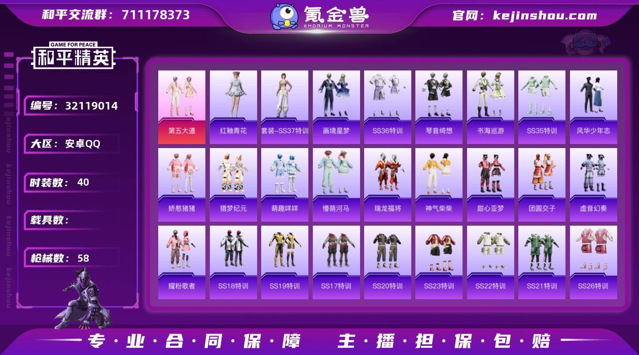 【和平精英】1粉装,8特效枪,0载具,历史最高段位:卓越王牌6星 王牌印记6次 热力值:38870,81套装,132枪械,131装备,75战备;套装:套装-第五大道,套装-特训学院,套装-青年教官,套装-骑行爱好者,套装-竞技名士,套装-长空猛禽,套装-冷焰舞者,套装-滨海假日,套装-沙漠毒蛇,套装-坚韧舞者,套装-竞技达人朋克,套装-荣耀,套装-极地朋克,套装-幻世战舞者,套装-甜蜜菠萝,套装-缤纷果语,套装-冰川特警,套装-雷霆特警,套装-格斗先锋,套装-破蛋小黄鸡,套装-疯狂小兔子,套装-夏日音浪,套装-风华少年志,套装-牛气满满,套装-战术大师,套装-狙击之神,套装-牛气冲天,套装-SS18特训,套装-耀粉歌者,套装-电音精灵,角色-赛罗奥特曼,套装-SS17特训,套装-瑞龙福将,套装-团圆交子,套装-福星高照,套装-虎虎生威吉莉,套装-空投萌叽,套装-SS19特训,套装-炫蓝之夏,套装-SS20特训,套装-猎梦纪元,套装-甜心亚梦,套装-虚音幻奏,套装-SS21特训,套装-萌趣咩咩,套装-娇憨猪猪,套装-SS22特训,套装-SS23特训,套装-神气柴柴,套装-懵萌河马,套装-王牌教练,套装-SS24特训,套装-龟仙人,套装-SS25特训,套装-惊鸿侠骨,套装-锦衣飞扬,套装-SS26特训,套装-焰鹰斗篷,套装-幻羽潜行,套装-SS27特训,套装-SS28特训,角色-湖雨初晴,套装-海盐绵绵冰,套装-SS31特训,玩偶服-喜羊羊,套装-元气之梦,套装-SS34特训,套装-薄荷星砂,套装-SS35特训,套装-琴音绮想,套装-画境星梦,套装-书海巡游,套装-SS37特训,套装-SS36特训,套装-红釉青花,套装-雪国风尚,套装-雨过天青,角色-幽雨猫猫,套装-福马献瑞,套装-马上有钱,套装-玲珑侠影;枪皮:蜜獾-娇憨猪猪,蜜獾-垂柳戏鸭,蜜獾-天降萌叽,蜜獾-精灵梦叶罗丽,蜜獾-启元战纹,GROZA-银河战甲,GROZA-懵萌河马,5级AUG-罪夜之冕,AUG-耀粉...