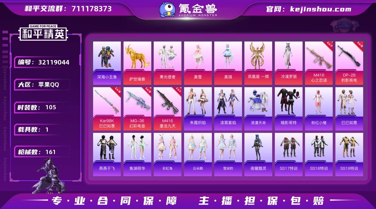 苹果 【公主号 浪漫天命/深海小丑鱼/暗影哥特/凤凰座 一辉/M416-心之恋语(七级)/护世瑞兽/】手Q-5粉装-6特效枪-1载具-8粉色飞行器-49777热力值-9王牌印记-105套装-161枪皮 【热门品类】:套装-浪漫天命,套装-深海小丑鱼,套装-暗影哥特,套装-粉红小猪 【粉色套装】:粉装-寒光使者,角色-美雪,角色-美琪,角色-凤凰座 一辉,角色-冷漠罗丽 【粉色枪皮等级】:M416-心之恋语(七级),M416-墨龙九天(一级),UMP45-萌骑冒险(一级),Kar98K-巳巳如意(五级),DP-28-豹影疾电(五级),MG-36-幻彩电音(五级) 【粉色载具】:护世瑞兽 【粉色枪皮】:M416-心之恋语,M416-墨龙九天,UMP45-萌骑冒险,Kar98K-巳巳如意,DP-28-豹影疾电,MG-36-幻彩电音 【粉色飞行器】:炫彩糖果飞行器,镜域双华-灵镜之阶,巴啦啦小魔仙飞行器,龙翔九天飞行器,凤舞九天飞行器,万象金身飞行器,月下星之子飞行器,圣域金龙飞行器 【粉色降落伞】:洛神天依降落伞,音爆索尼克降落伞,飒粉甜心降落伞,巴啦啦小魔仙降落伞,精灵梦叶罗丽降落伞,墨龙九天降落伞,金丰海韵降落伞,幻梦之森降落伞,彩虹独角兽降落伞,樱桃泡泡降落伞,圣斗士星矢降落伞,炫彩糖果降落伞 【稀有套装】:套装-巳巳如意,套装-炫彩糖果,角色-阿虎,套装-燕燕于飞,套装-鱼渊荷华,套装-彩虹兔,套装-云朵鹅,套装-雪绒豹,角色-夜瞳黯灵,套装-朱霞炽焰,套装-凌霄紫焰,套装-红釉青花 【稀有枪皮】:AKM-海渊国主,AKM-生命誓言,AKM-虎虎生威,M16A4-幻世战舞者,M16A4-甜心亚梦,M16A4-红色方程式,SCAR-L-夜灯,SCAR-L-炫彩节奏,SCAR-L-玉兔迎春,SCAR-L-红色方程式,M416-糯团青竹,M416-红色方程式,GROZA-彩虹符号,AUG-天降萌叽,AUG-耀粉歌者,AUG-金蛇镇世,QBZ-彩虹符号,M762-天降萌叽,M762-瑞龙福将,M762-云朵鹅,G36C-镜域双华,AC-VAL-天降...