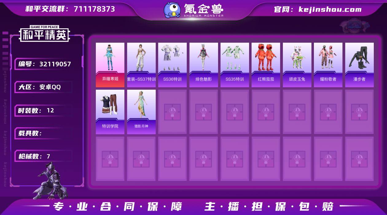【和平精英】1粉装,2特效枪,0载具,历史最高段位:超级王牌3星 王牌印记3次 热力值:14746,53套装,53枪械,72装备,41战备;套装:角色-异瞳寒姬,套装-特训学院,套装-猎鹰,套装-青年教官,套装-黄色运动,套装-蓝色运动,套装-黑色伏地魔,套装-深蓝色名流,套装-酒红色名流,套装-湖蓝色名流,套装-黄色名流,套装-猛禽,套装-漫步者,套装-海岛探路者,套装-冷焰舞者,套装-灼焰舞者,套装-完美偶像,套装-幻影武者,套装-街头潮人,套装-蓝彩潮人,套装-魅力单车,套装-竞技达人朋克,套装-破晓战魂,套装-热血青春,套装-元素星魂,套装-极速红龙,套装-破蛋小黄鸡,套装-白熊同盟,套装-顽皮玉兔,套装-白糯汤圆,套装-狙击之神,套装-耀粉歌者,套装-红熊茄茄,套装-柠萌假日,套装-云魄琉璃,角色-绯色魅影,套装-SS33特训,角色-猎影月神,套装-青翼流星,套装-狂鲨锋刃,套装-炫彩糖果,套装-元气之梦,套装-SS34特训,套装-薄荷星砂,套装-SS35特训,套装-阳光菠萝,套装-SS37特训,套装-SS36特训,套装-雪国风尚,套装-超能元气,套装-萌鸡速递,套装-福马献瑞,套装-马上有钱;枪皮:AKM-涂鸦街区,AKM-霓彩脉冲,AC-VAL-荒原烈焰,AC-VAL-钻光豹影,ACE32-冰晶雪宝,蜜獾-启元战纹,SCAR-L-红色方程式,SCAR-L-夜灯,SCAR-L-彩虹符号,SCAR-L-绿洲时空,AUG-耀粉歌者,AUG-冰晶雪宝,M416-蓝色火焰,M416-红色方程式,Famas-霓彩脉冲,Famas-乌木金纹,GROZA-福马献瑞,SVD-霓彩脉冲,AWM-绿洲时空,AMR-乌木金纹,Win94-乌木金纹,Mini14-耀粉歌者,Mini14-鸡智如我,SLR-霓彩脉冲,SLR-乌木金纹,MK12-乌木金纹,MK20-H-狂鲨锋刃,1级Mk14-福马献瑞,UMP45-夜灯,UMP45-极意拳锋,MP5K-乌木金纹,AKS-74U-乌木金纹,汤姆逊-像素花束,UZI-红色方程式,UZI-炫彩糖果,S12K-夜灯,S12K-霓彩脉冲...